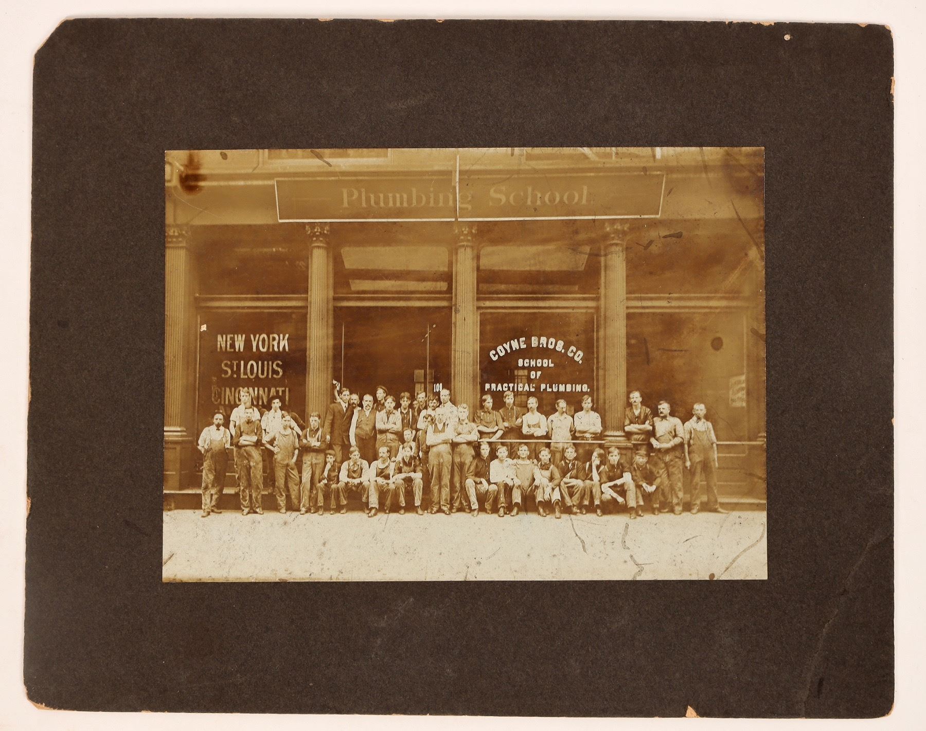 A photograph of the Coyne Bros. Co. School of Practical Plumbing. A group of forty men pose for the photograph outside of the plumbing school, which has a sign advertising locations in New York, St. Louis, and Cincinnati. [