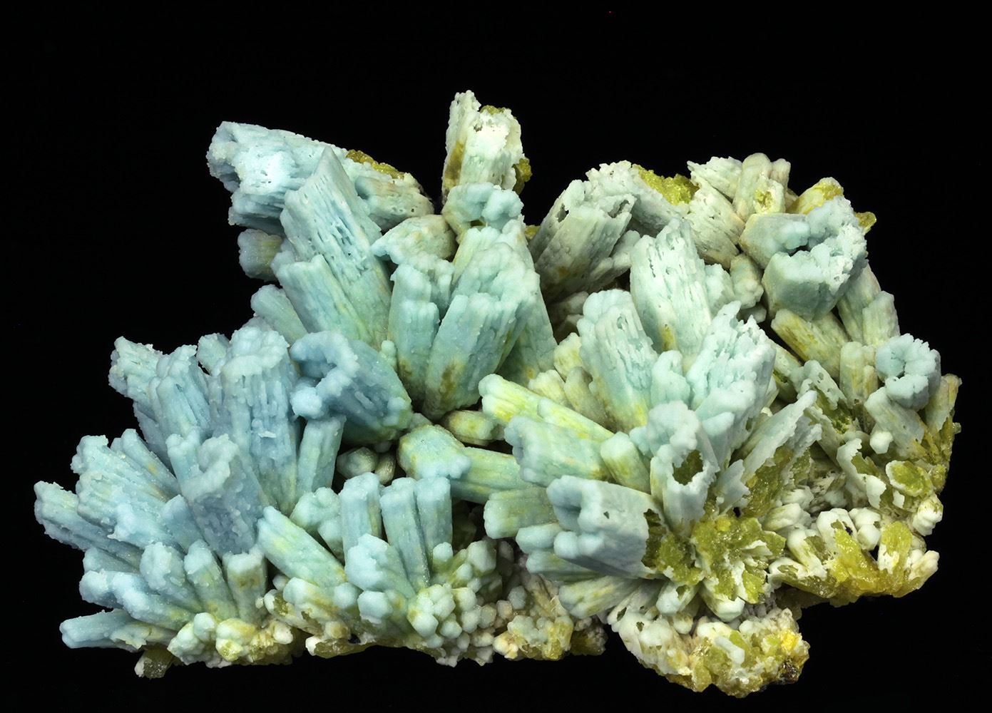 This is a spectacular pseudomorph of plumbogummite after pyromorphite. The term pseudomorph means "false form" and indicates that the underlying pyromorphite (greenish-yellow) have been overgrown and partially to completely replaced by the sky-blue colored plumbogummite, yet the initial crystal FORM of the pryomorphite has been preserved during the chemical transformation. This specimen ranks among the sharpest/most well preserved specimens of plumbogummite after pyromorphite to have been recovered from the deposit. Dimensions (cm): 5 H x 9.1 W x 5.5 D. Location: Yangshuo Mine, Yangshuo Co., Guilin Prefecture, Guangxi Zhuang Autonomous Region, China City: State: China Date: HWAC# 53055