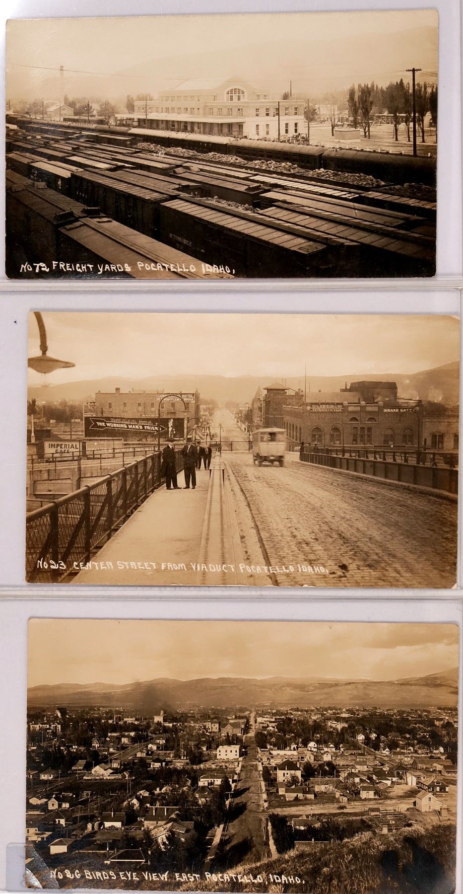 Post cards published by Pacific Photo Co. Salem, Oregon. No 26 Birdseye View of East Pocatello, Idaho - No 33 Center Street from Viaduct Pocatello Idaho - No 72 Freight yards Pocatello Idaho,