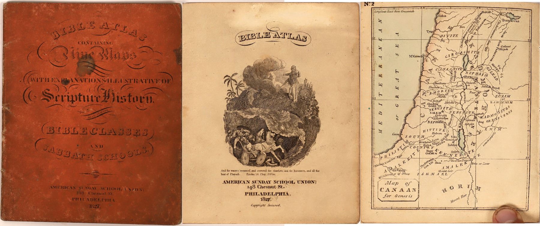 Small (5.25" x 4.25") leather bound Bible Atlas displaying maps of the Middle East from Biblical times. Eight color maps enclosed. Explanations in back two pages. Published by the American Sunday School Union, Philadelphia, 1827. Spine frayed but holding. Covers and binding intact. Good condition.