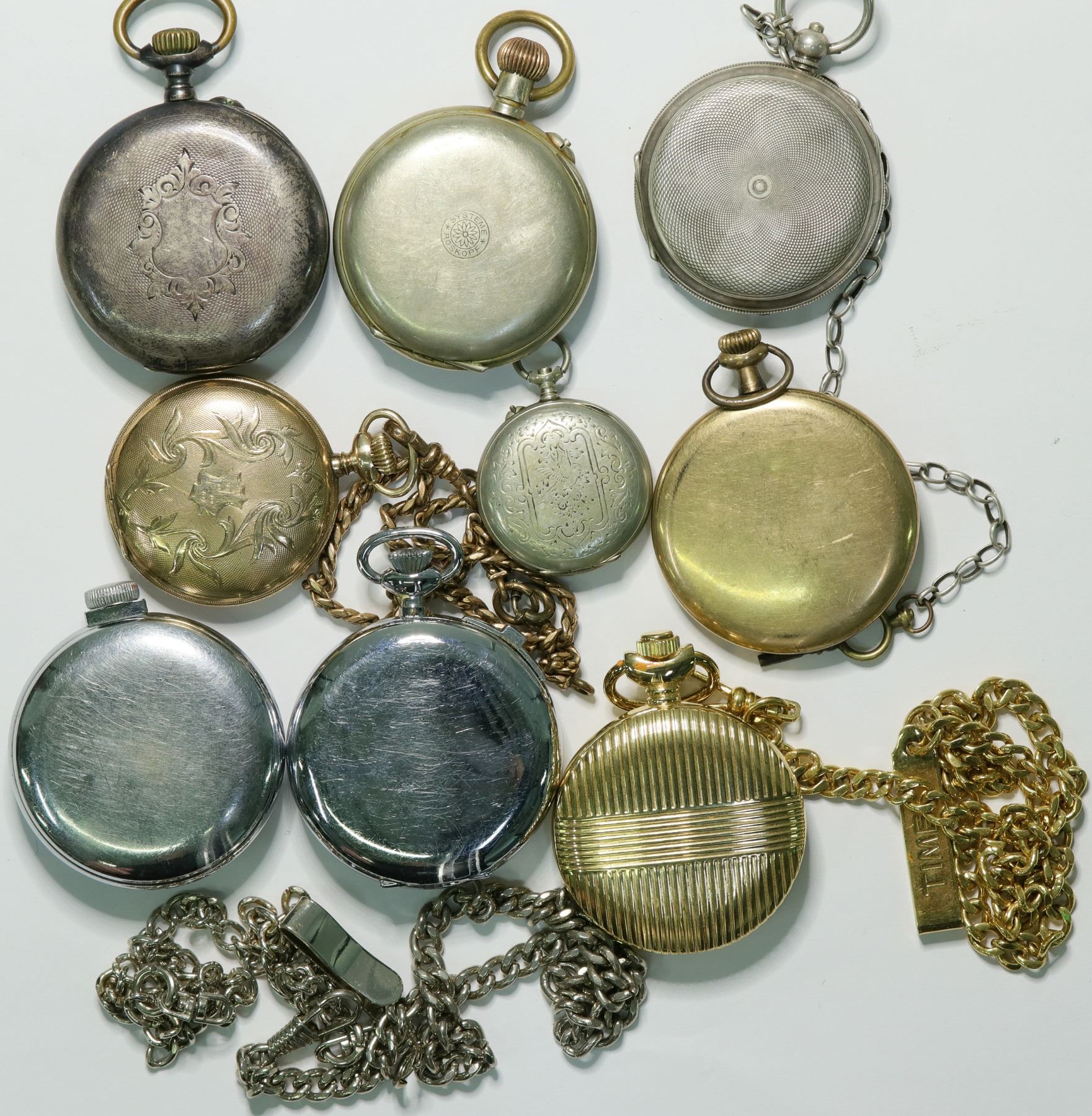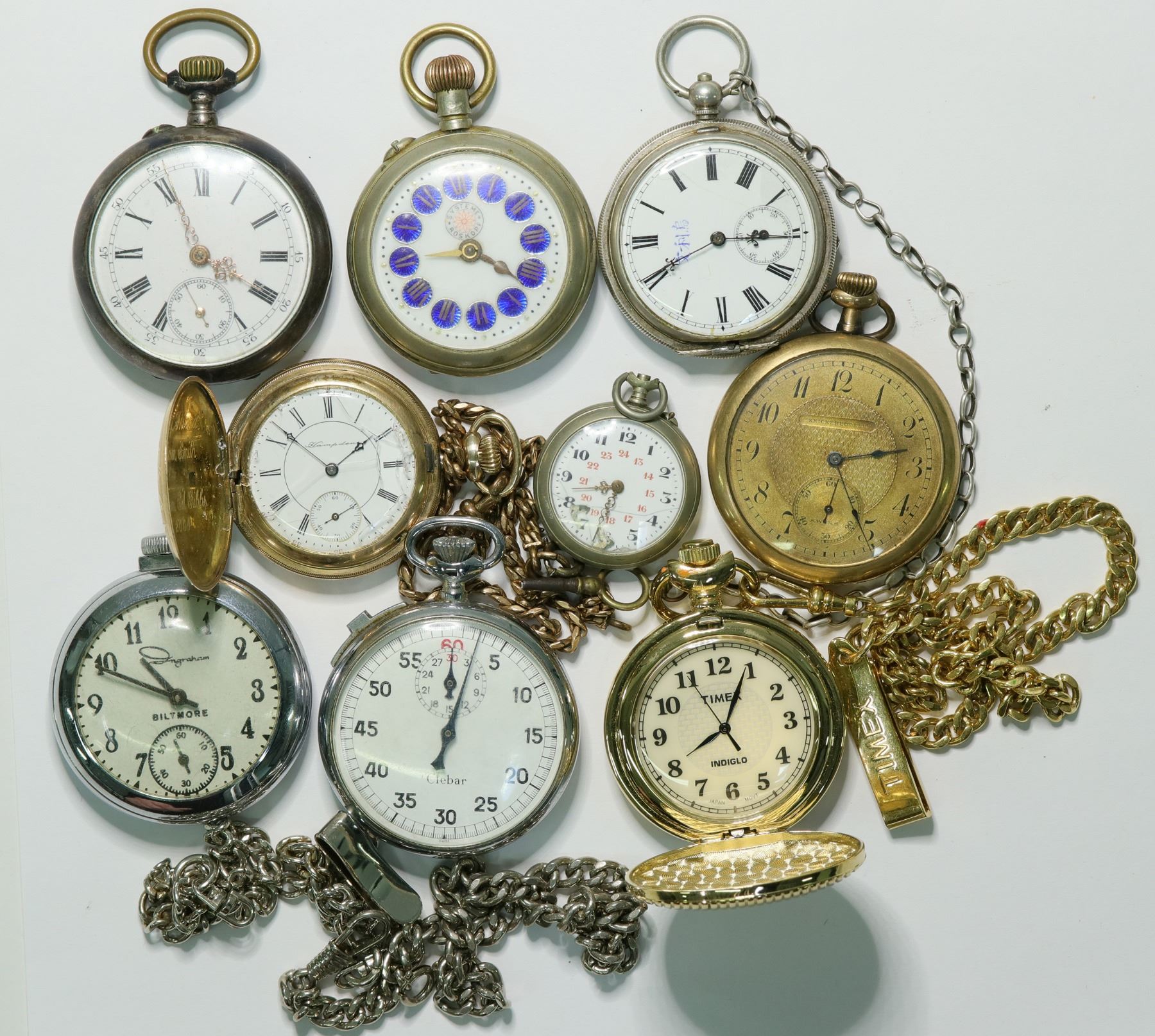 System Roskopf, fancy face plate, no markings on movement, nickle, 1.8" diameter; Moeri Patent movement, swiss, silver, 1.9" diameter; Hampden (cracked galss cover), Model 3, 3s, 1902 made, gp. Persian stlye markings, nickle, 1.75" diam, cover missing; SKFA, 1.25" diam, broken face plate; Knickerbocker, GP, 2" diam,; Ingrahm, Biltmore2" diam; Timex Indiglo1.75" diam; Clebar stopwatch1.8" diam Unknown if any working, except stopwatch- which is working.