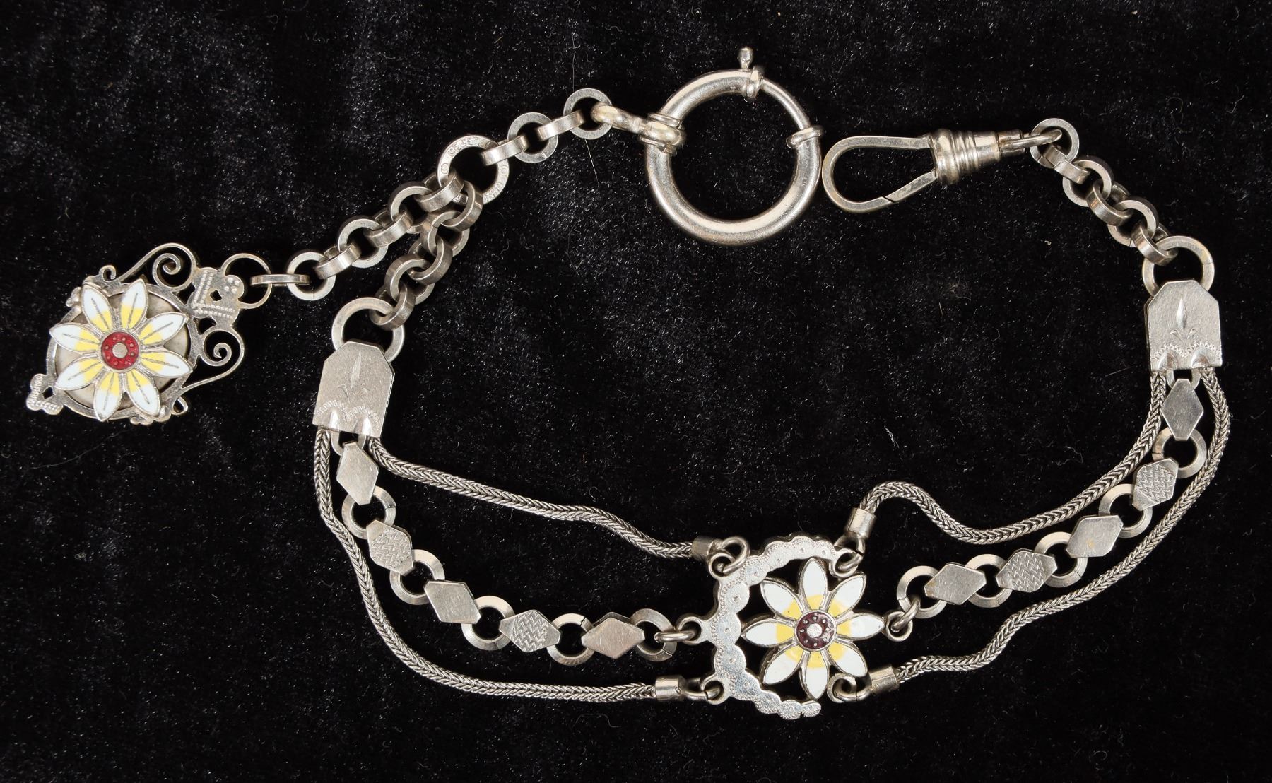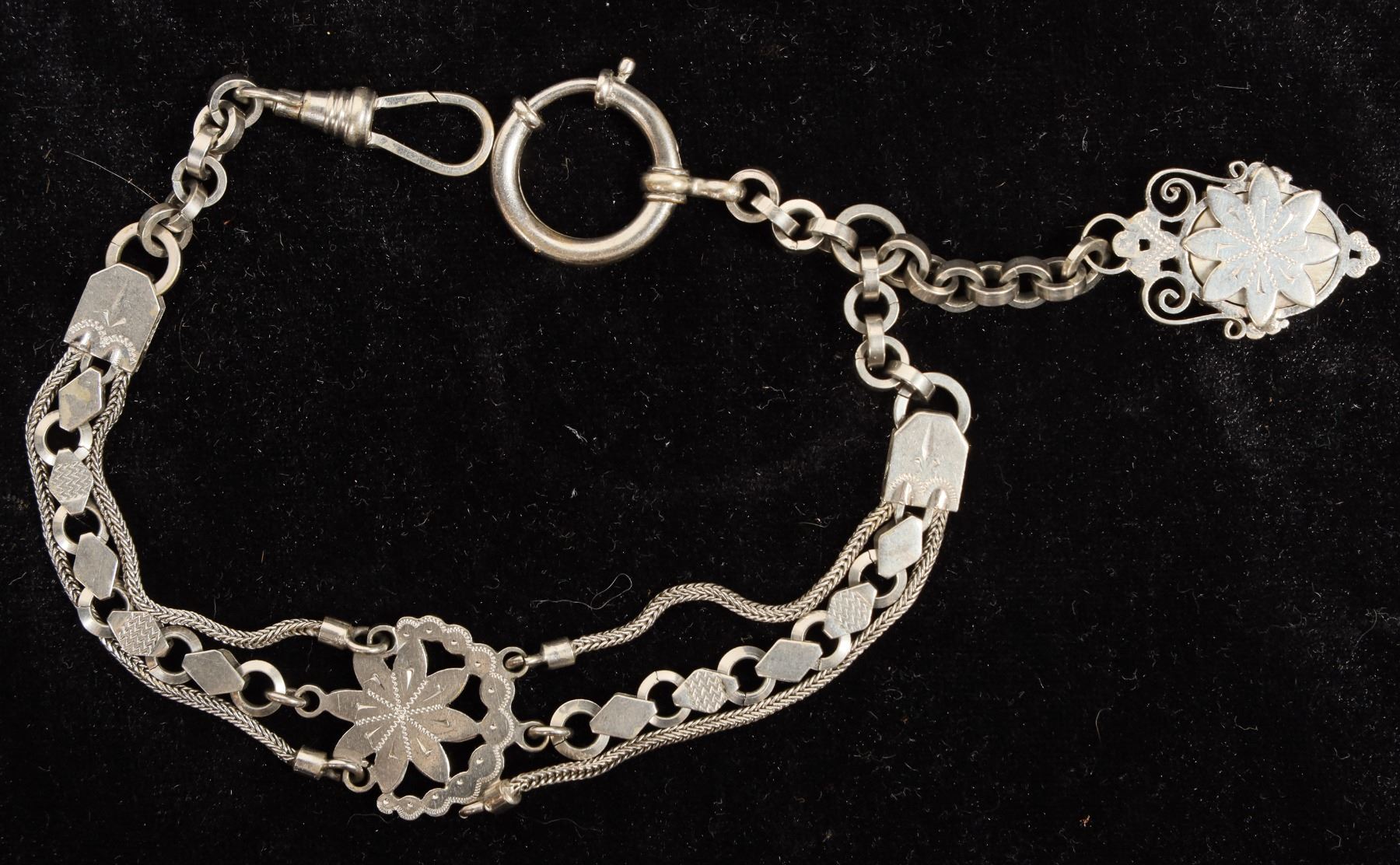 Pocket Watch Chain, Fancy Floral Design - Antique. This may have belonged to the Reich/Schnitzer Family of Comstock, Virginia City, Nevada Brewery Fame. About 12 inches long. Custom made, unique antique chain. Unmarked silver.