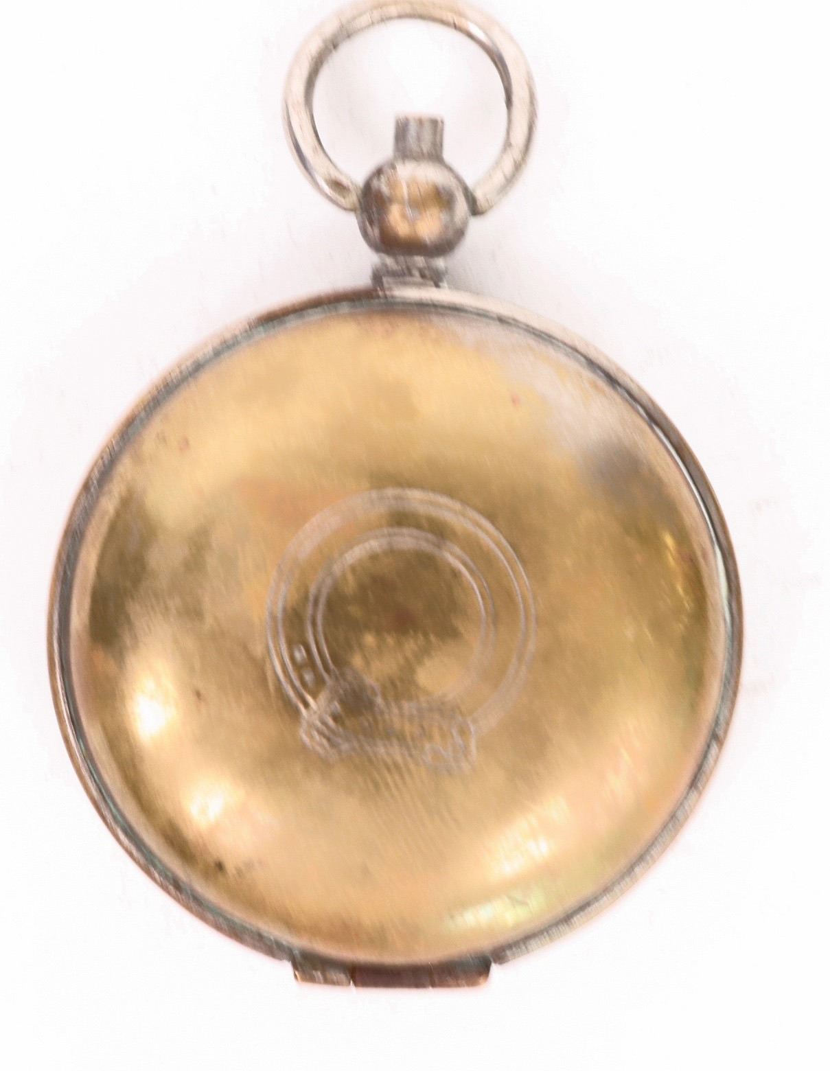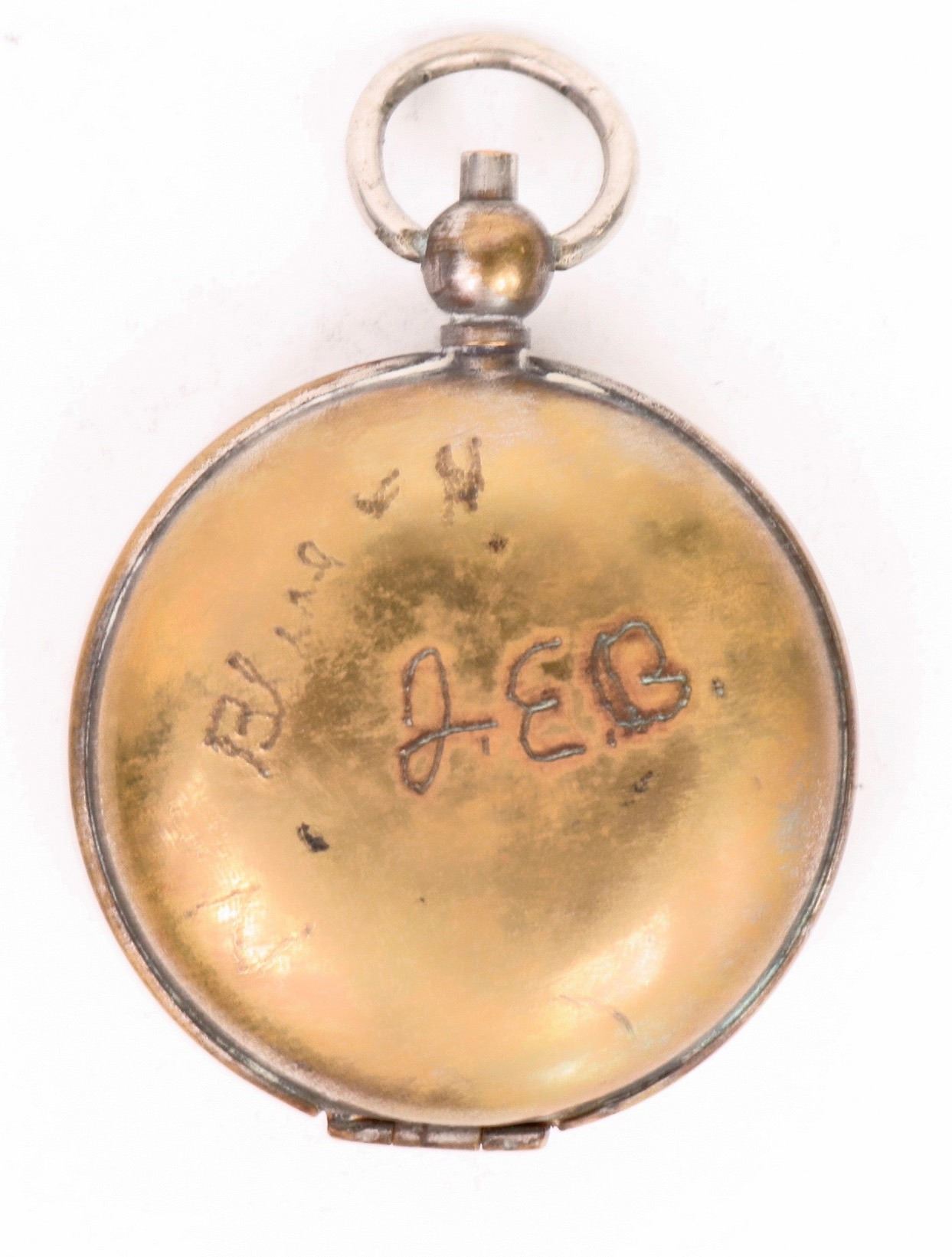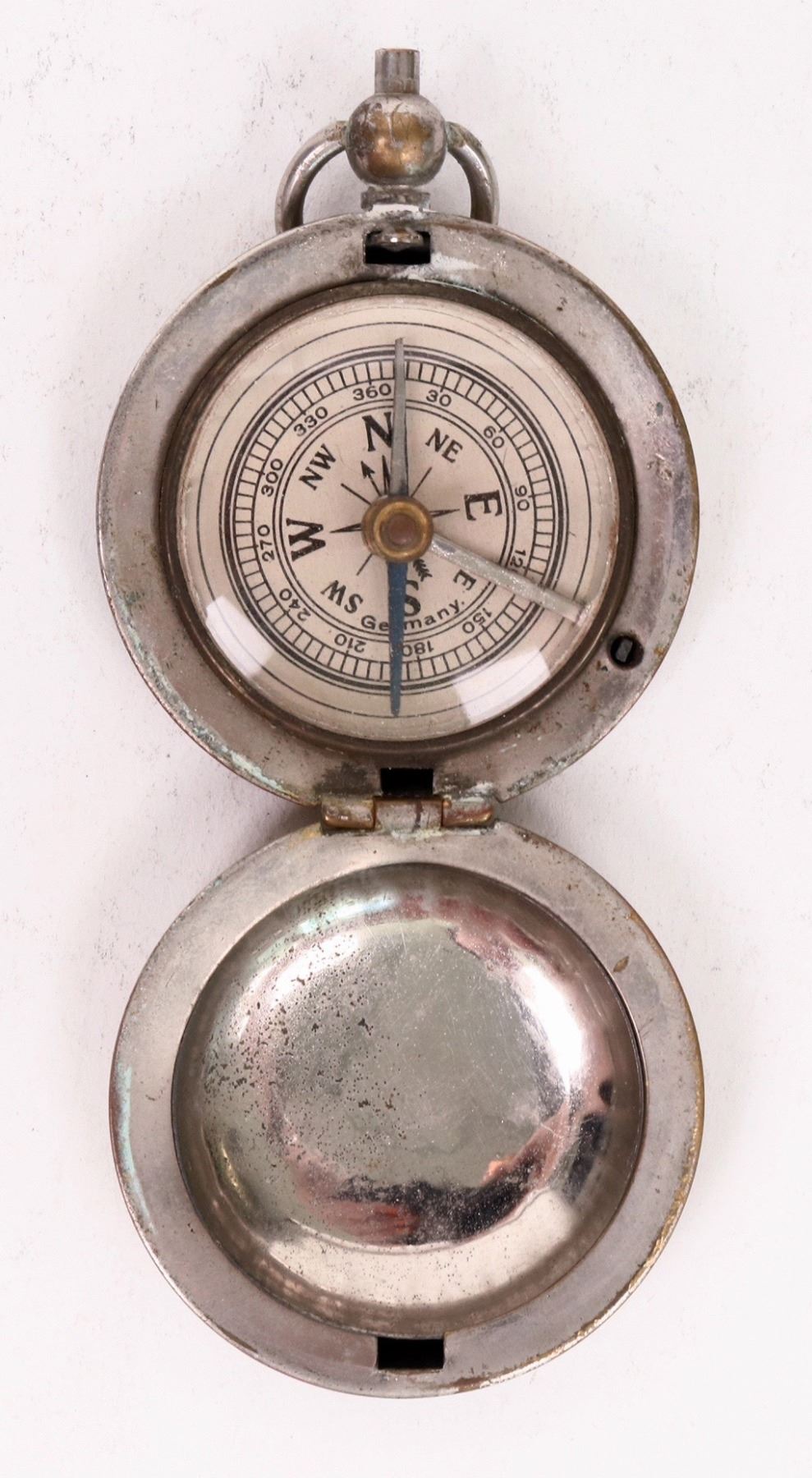 This is a pocket watch style compass made in Germany about 1900. The card is has a soft brass face and still works. 1.875. in. in diameter. Light patination inside case. Please see photo for details.