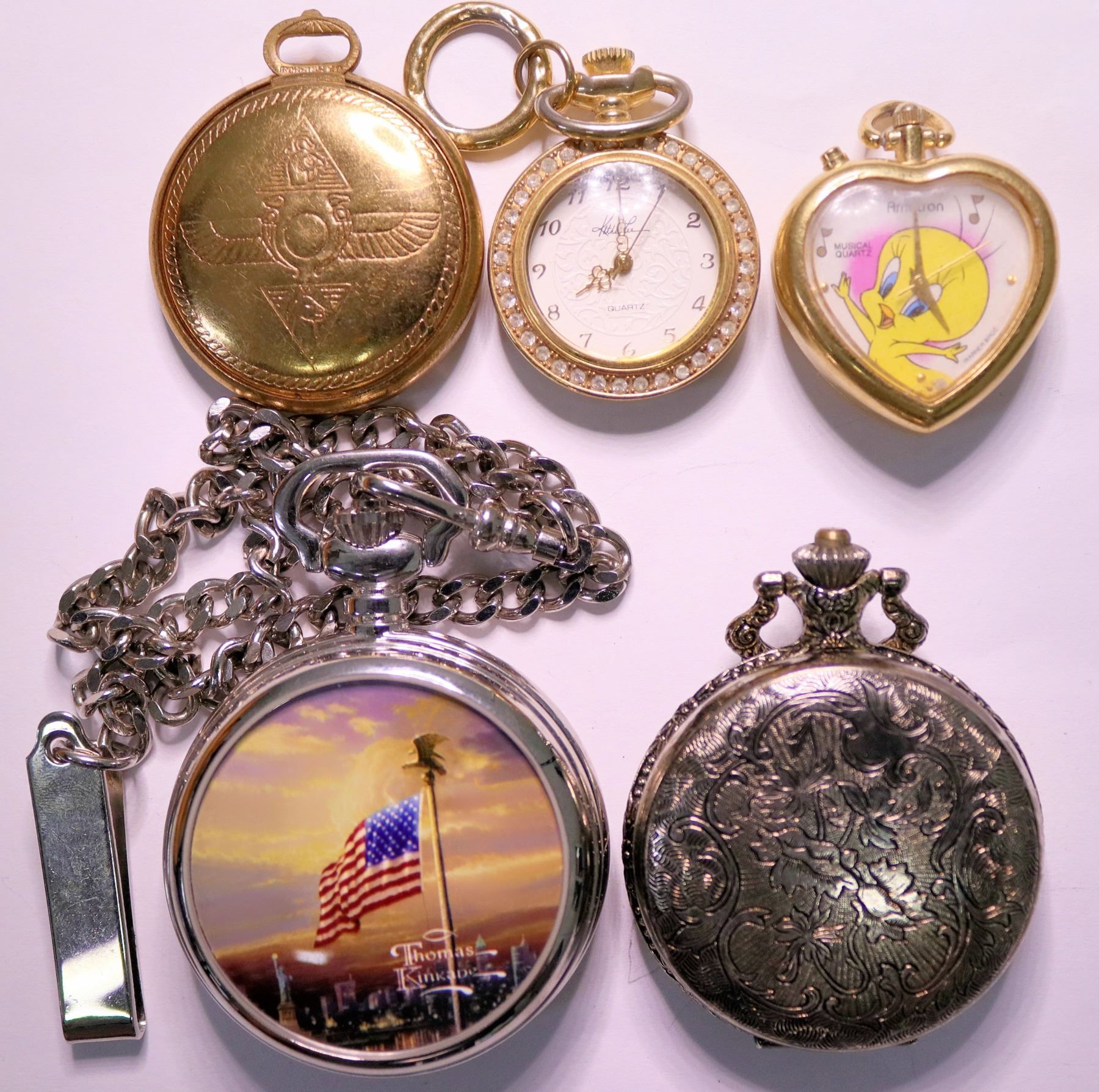 1) Antique pocket sundial and compass watch. Made by Robbins Company. Gold colored watch with silver face (c.1920's). The arm raises and lowers with degree markings on the sides. The reverse shows some Egyptian engravings. Some tarnishing. Needs chain. 2) Vintage engraved stainless steel round pocket analog watch patina needs cleaning. 3) Signed Thomas Kinkade American Flag The Light of Freedom stainless steel pocket watch with 14" chain. 4) Round Kathlee pocket watch encircled in gemstones in good condition. Needs chain 5) Warner Bros Looney Tunes Tweety bird musical heart pocket watch.