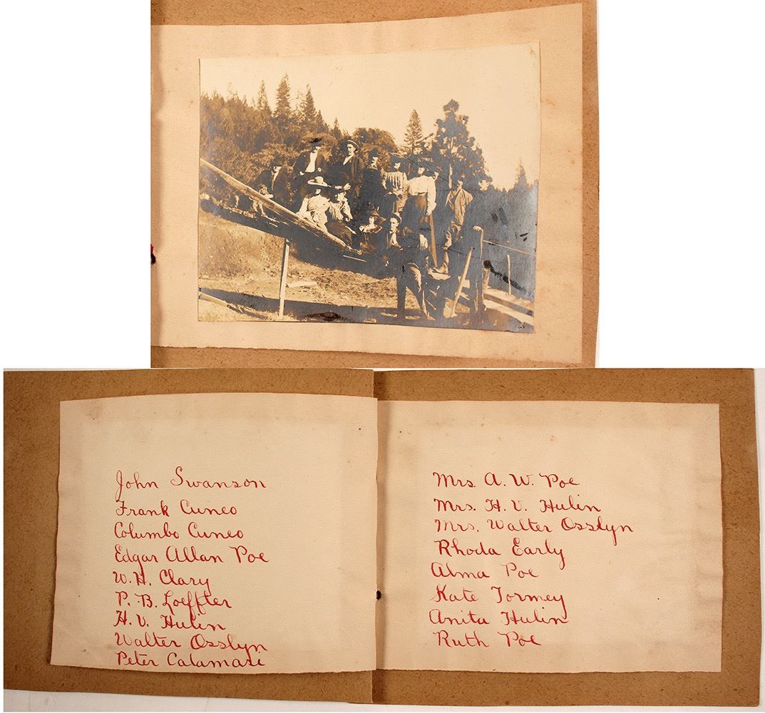Cardboard bound and red ribbon tied "Thanksgiving Souvenir, Indian Creek, Nov. 26 1903" . We are unsure which Indian Creek this is. 2 b/w Photos 3.75" x 4.5" of families including several Poe's, a Calamari, and more. Edgar Allan Poe is listed although the famous poet was deceased in 1903. Date: Location: HWAC# 56535