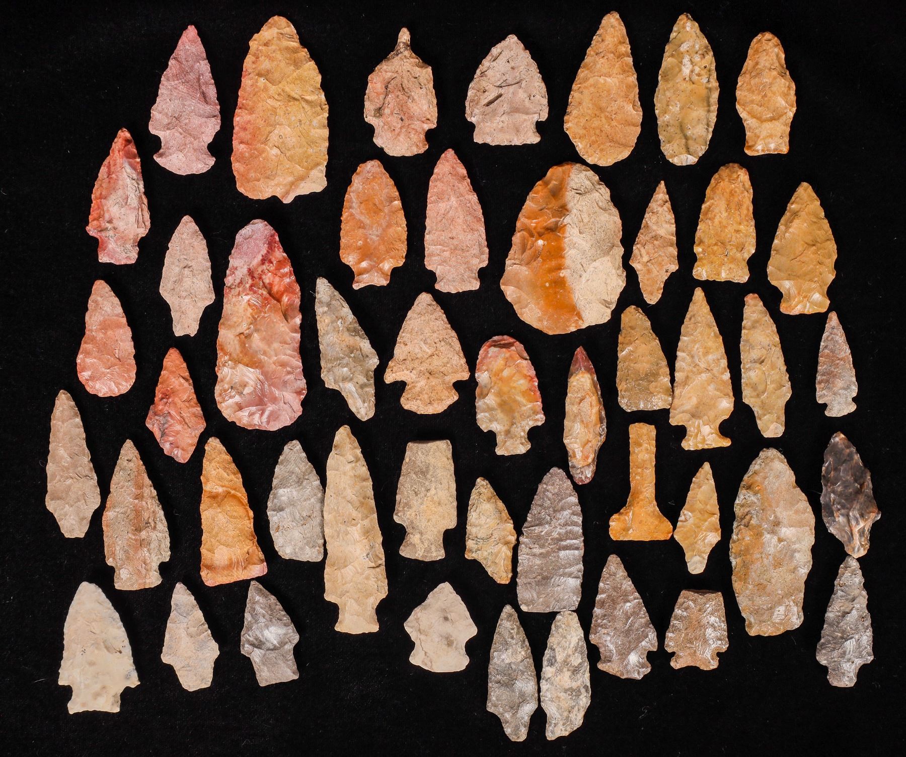 This lot of points has not been catalogued by the consignor. There are over 45 points and knives ranging from 1.5 in./ 38 mm to 3.5 in./ 89 mm. A total weight of 1.8 lbs. of stones/ points. There are several knives, a number of Gary points, a drill, a perforator, one small Scottsbluff, several Snyder or Grand points, one medium spear point, a Nodena point, two oval shaped blade points that have been heat treated, and many more. All points are likely from Arkansas. Please see photos for more details and enlargement. From the Bracken collection. (ref. Indian Relics for Northeast Arkansas and Southeast Missouri, Dethrow, 1985).