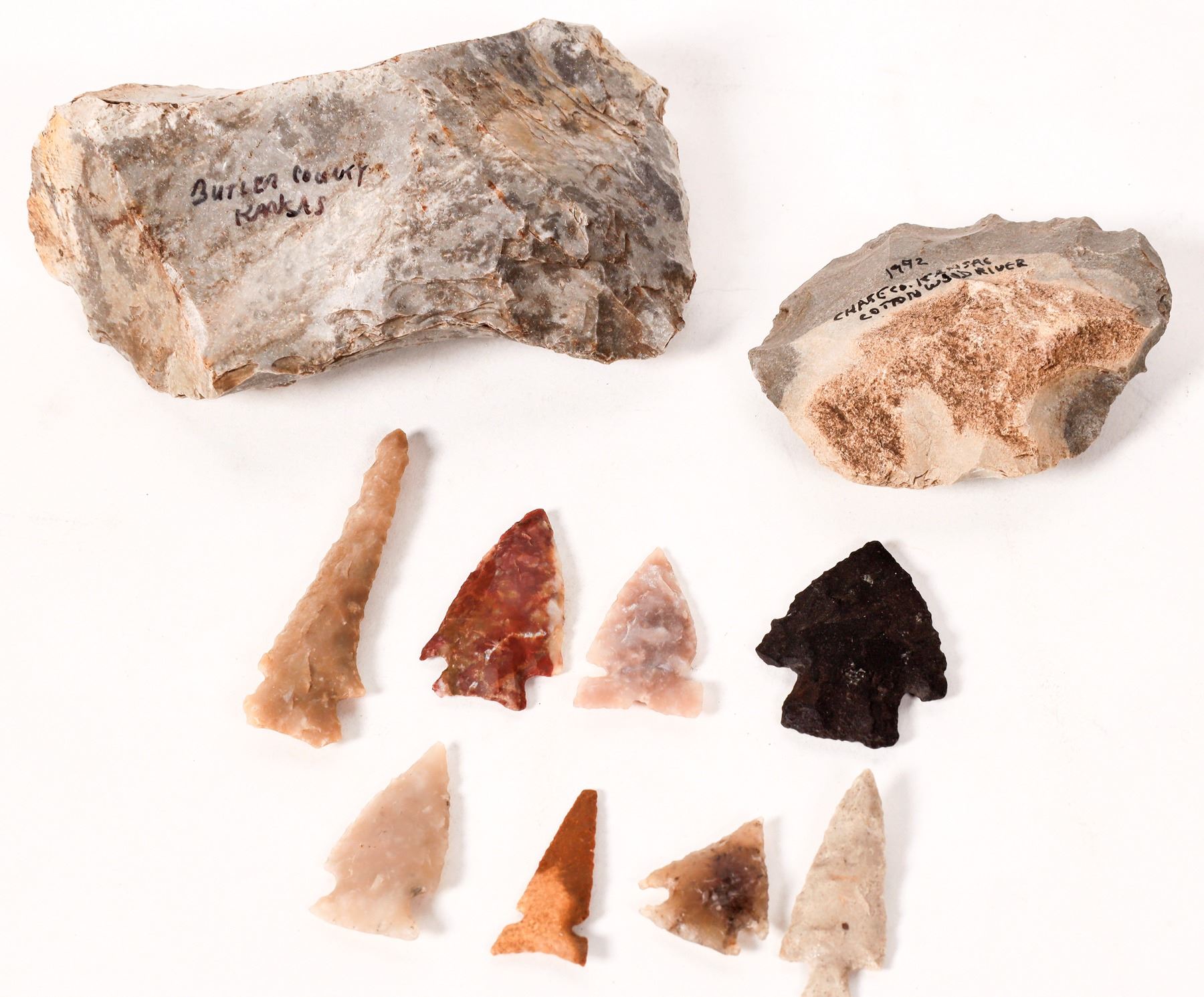 This group has six points: including a drill; a Harrell pint; one Flint Creek style point, and five more at 1.5 in. There is a large chopper or stemmed hoe at 4.5 in./ 114 mm and 12.5 oz. One scraper at 2.75 / 70 mm. From the Bracken collection. Please see photos for details. Kansas