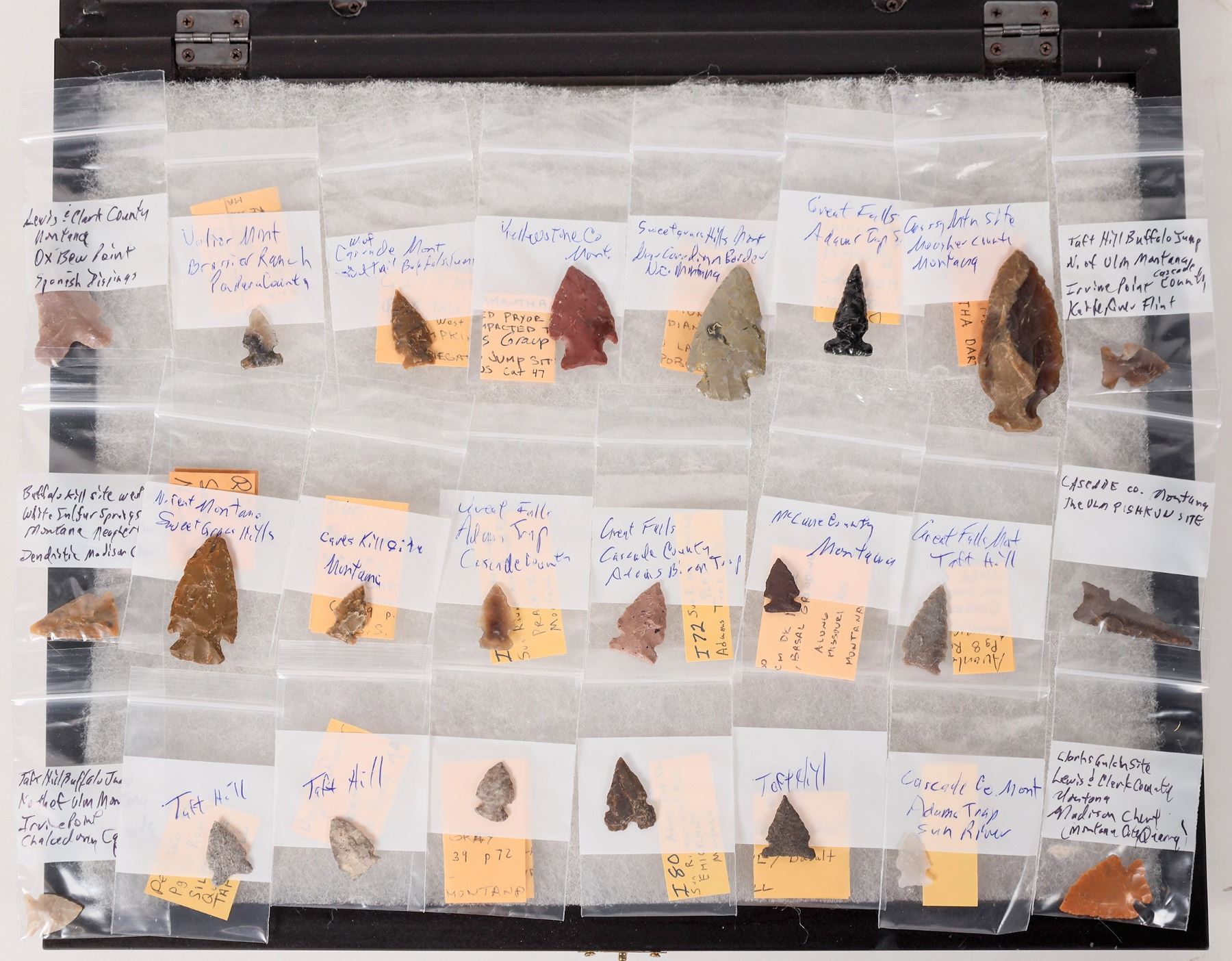 This collection of points is from the Great Falls area of Montana. There are 23 points in all. Each one is carefully detailed by style and location found. Great Falls and Taft Hill areas are listed. From the Bracken collection. Please see photos for details. Montana