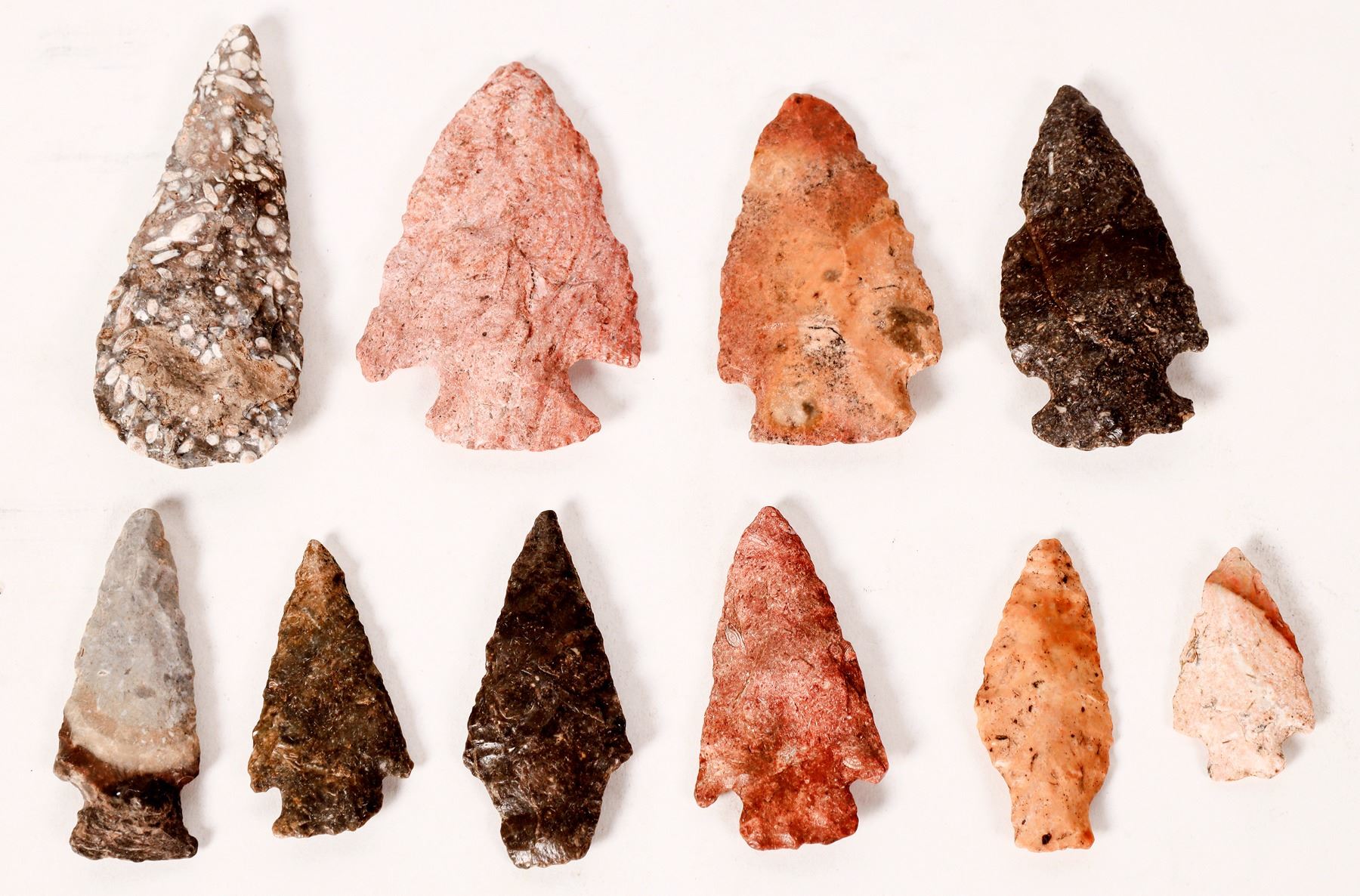 This lot contains points from Kay County, Oklahoma that includes at least three points of the Hardin style, one Gary point, and one knife with great structure. A total of 10 points in all. One red Hardin point at 2.5 in./ 64 mm, the knife at 2.75 in. 70 mm, and one Gary point grey at 2.in./ 51 mm. From the Bracken collection. Please see photos for details. (ref. https://www.projectilepoints.net/; Indian Arrowheads, Overstreet, 1991, pp.364-372). Oklahoma