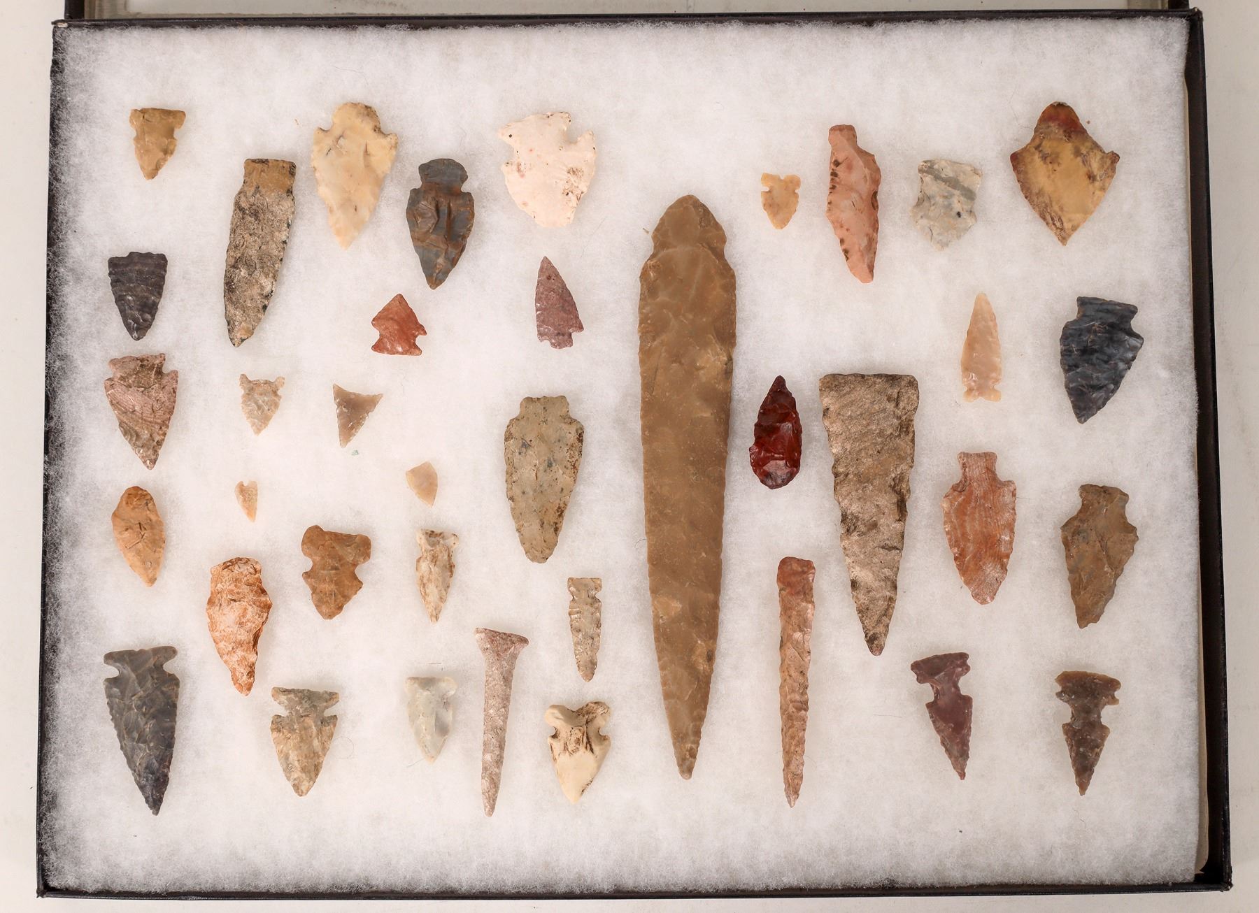 This unlabeled group of over 30 points is a treasure from the Bracken collection with a large lanceolate in the center at 8 in. It has weak shoulders and a flaked bottom thought to be from Tennessee. There are two Big Sandy E notched points (in the upper left corner) with one side E notch and another E notch on the base, very rare finds from Tennessee at 1.75 in. There is a 4 in. lanceolate with a flat bottom in the Stanfield style also from Tennessee (left of center). There are two drills at the top at 3 in. and 3.5 in. A Scottsbluff lanceolate is at 2.5 in. with a flat bottom and stained from the pitch used to secure it to a shaft (lower right). There is a Hamilton style point at under 1 in. from Tennessee. A Hardaway point at .75 in. likely from TN, and a Thebes point also from TN. There is a Gary point (lower left corner) from Arkansas with great coloration. The riker box is 12 in. X 16 in. Please see photo for details.