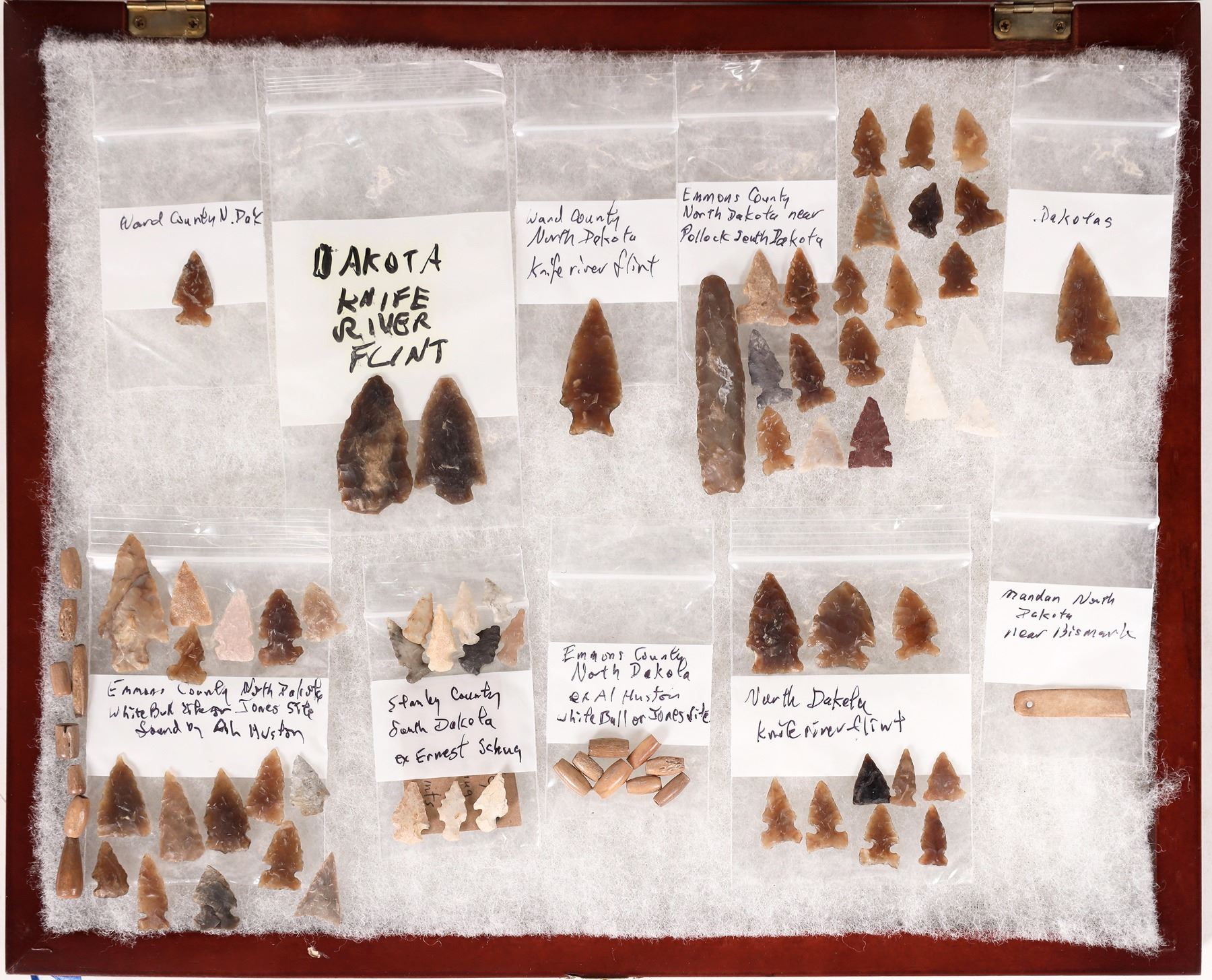 This lot has over 40 points from both North and South Dakota. There are 16 tube beads that are hand drilled and appear to be of bone. The bone used has a patination indicating that the bone may have been cooked. (Some beads are drilled from both directions and do not line-up.) One bone pendant. One lanceolate at 2.75 in. /70 mm. About 40 Flint River obsidian points. All are a spectacular root beer color. Each group has been cataloged by location found for the Bracken collection. A beautiful collection of points and artifacts in a display box 12 in. X 15 in. Please see photos for details and enlargement.