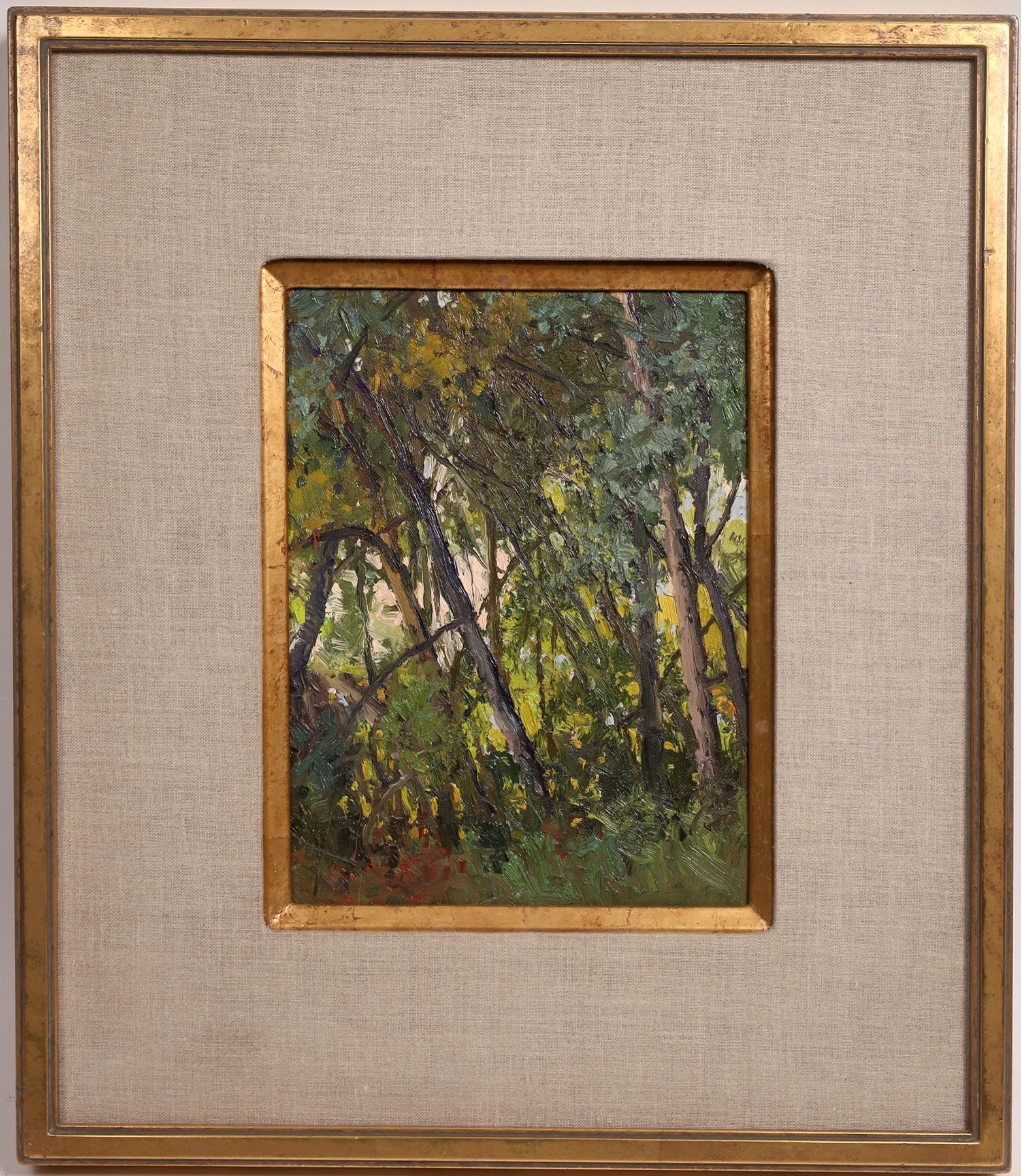 An 12 x 9 inch oil on canvas entitled "Poison Ivy With Cottonwoods," by Len Chimel. 1992. Gilt frame is 18 x 21 inches. Sold at Stremmel Gallery. Len Chimel has had numerous sell-out one-man shows and is listed in Who's Who in America and Who's Who in the West. He has been featured in numerous publications including Southwest Art Magazine, Business Week, Western Art Digest, and American Artist Magazine. His works are currently featured at Maxwell Alexander Gallery in Los Angeles and the Simpson Gallagher Gallery in Cody, Wyoming. A book featuring his work "An Authentic Nature" was written by Amy Scott. State: City: Date: Provenance: