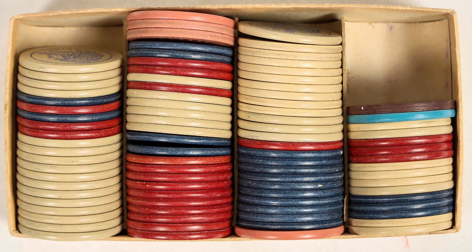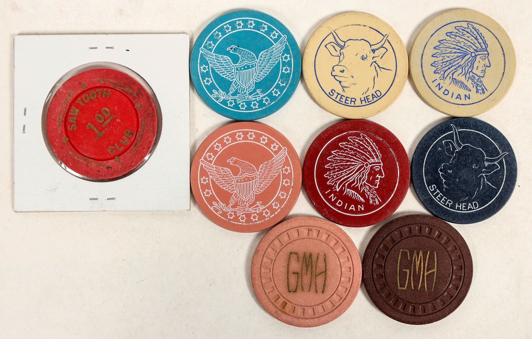 Eight nine vintage poker chips. Many Steer Head, and Indian chips. $1 casino chip from the Saw Tooth Club, Ketchum Idaho.