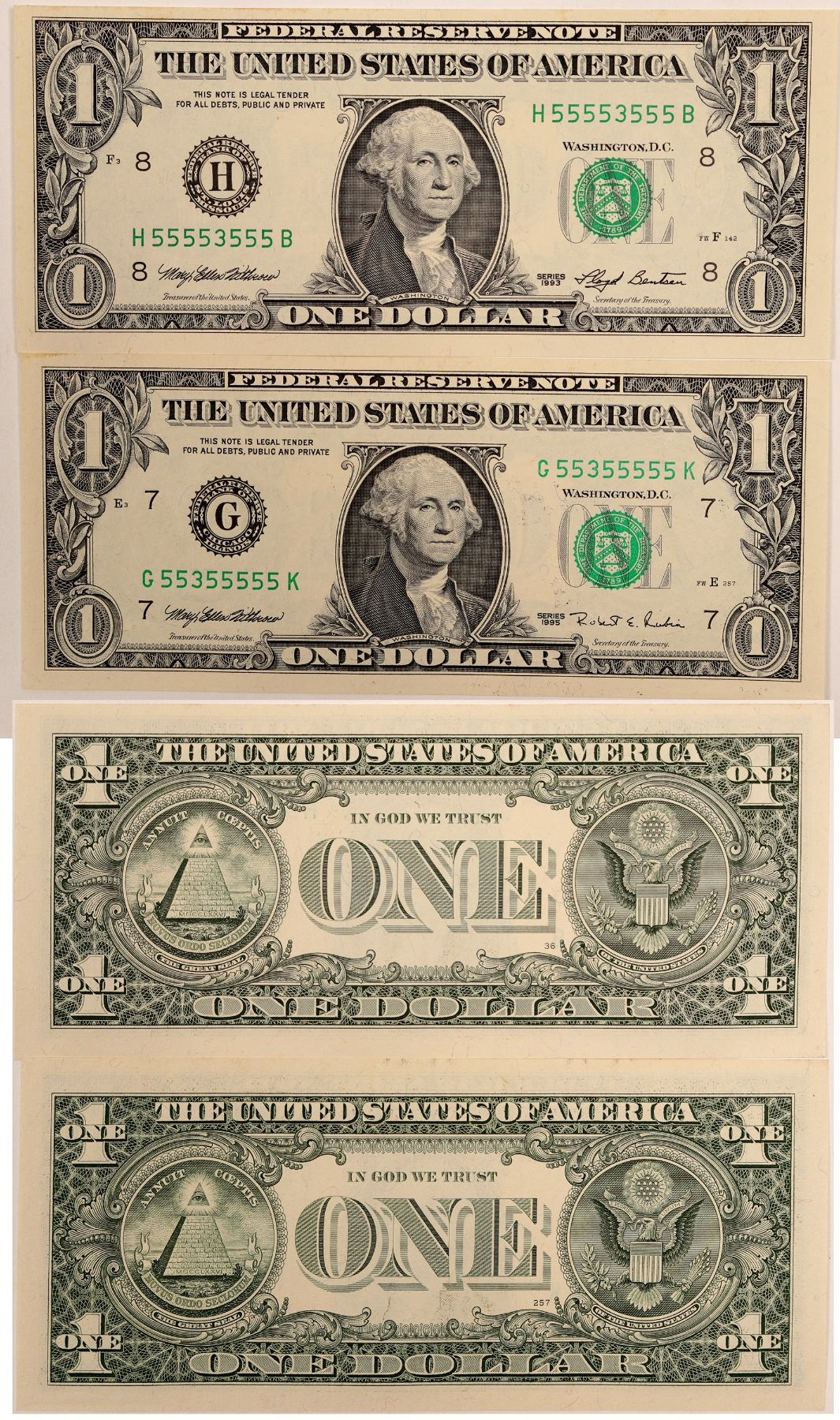 Series 1993 and 1995 with s/n 55553555 and 55355555. Uncirculated.