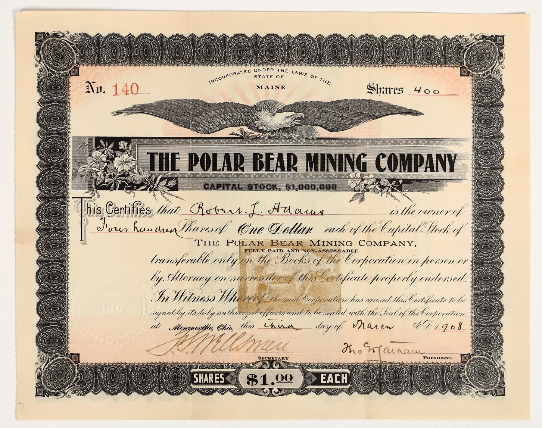 Fantastic! Inc. in Maine. No. 140, issued for 400 shares to Robert Adams in 1908. Signed by president Thomas Latham and the secretary. Not cancelled. Black border and print, with gold polar bear underprint vignette! According to a full page ad in The Plain Dealer (March 29, 1908), the company had 5 claims at Miller Creek, Alaska.