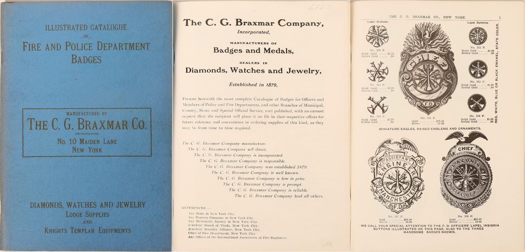 The C.G. Braxmar Co., 10 Maiden Lane, New York, NY - 1912 Catalog for Police & Fire Department Badges & Medals (6" x 9" SC Booklet- 105 pp,, Excellent condition)