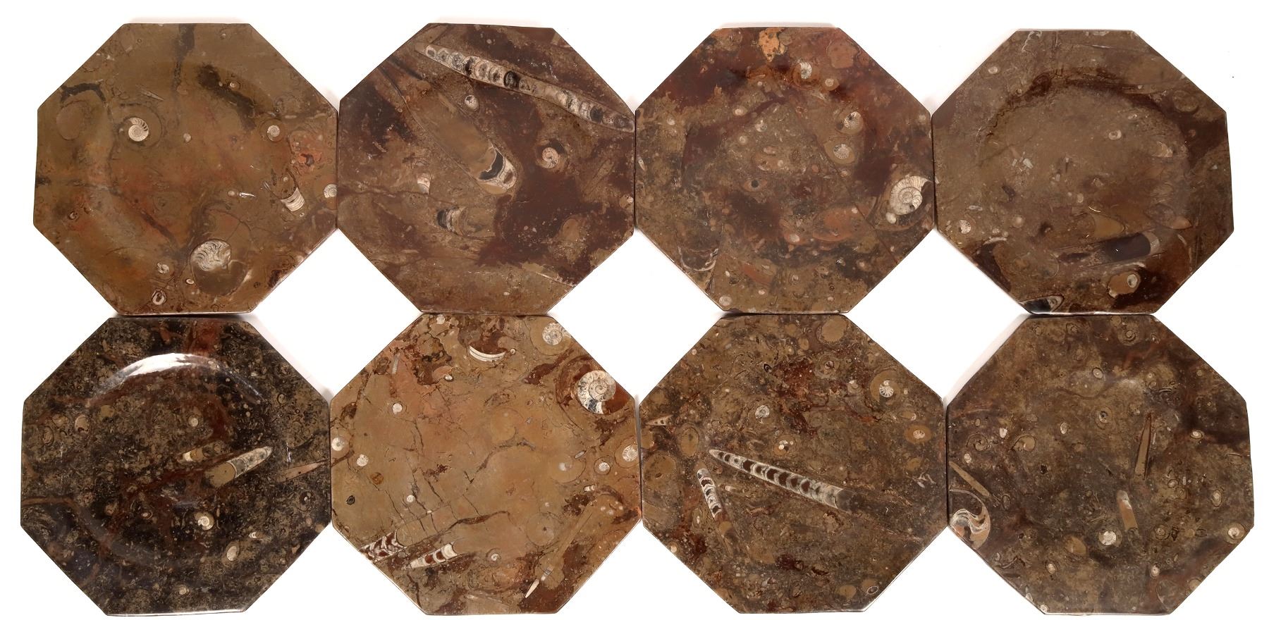 8 fantastic octagonal polished fossil plates. We occasionally see smaller polished plates but rarely large plates such as these 11.5" beauties. Perfect for entertaining!