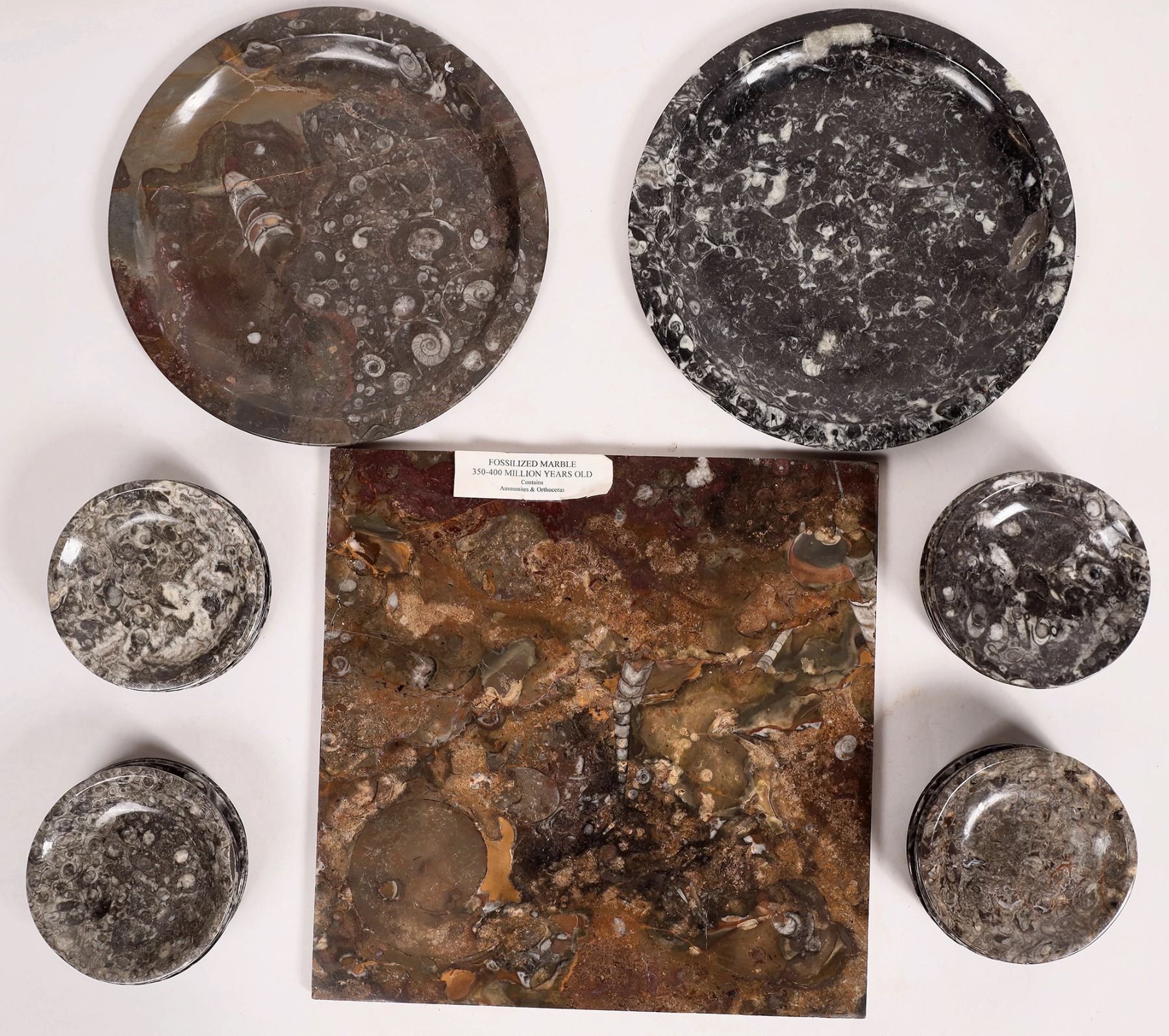 12x12" ammonite and Orthoceras tile. 2 9.5" plates. 28 4.5" plates.