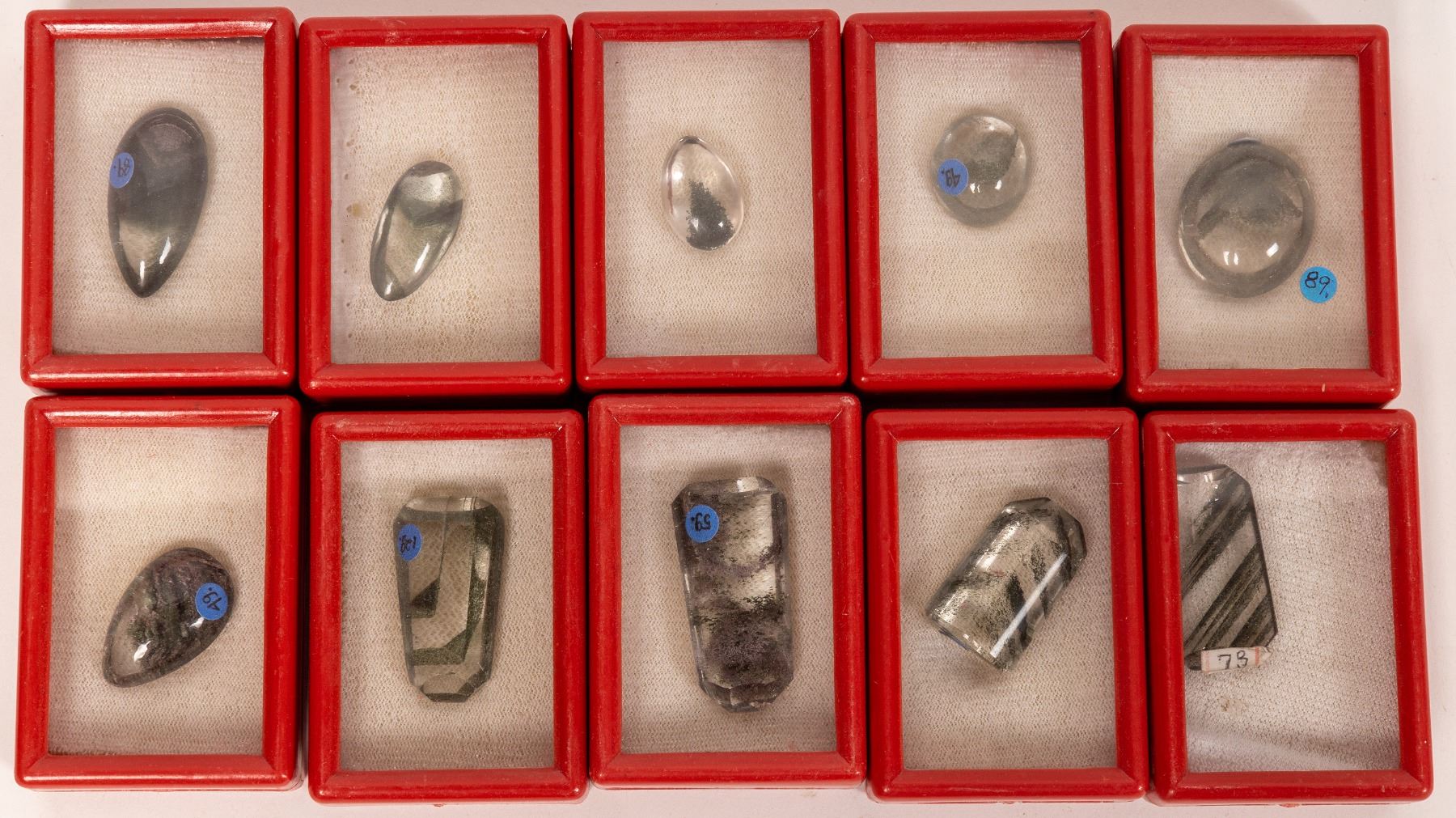 Ten pieces of polished quartz that contains large, greenish, natural inclusions (possibly epidote) that resemble landscapes or abstract designs which are magnified by the curved shape of the quartz. Shapes include round, teardrop, and columnar. Sizes are all about 0.75 x 1.5" or so. Each comes in a two-part, plastic, windowed gift box about 1.75 x 2.5 x 1". China Chunlin Zhu Collection