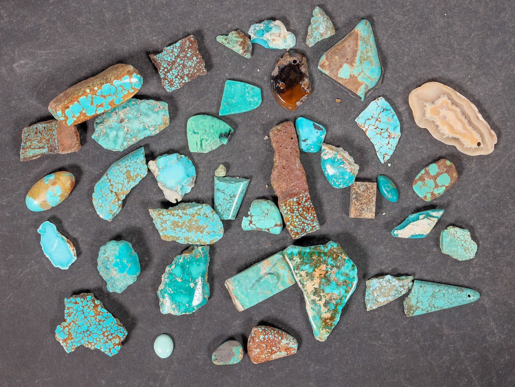 Small turquoise pieces - most have experimental polished sides. Variety of colors: lot has both greens and blues. Nice spiderweb matrix on several pieces. Approximate weight 5.1 ounces. Pieces range from around .5" to 1.75" in length. This turquoise originates from the No. 8 turquoise mine of Cortez, Nevada, often considered one of the top turquoise mines in the world. It was previously in storage for 35 years.