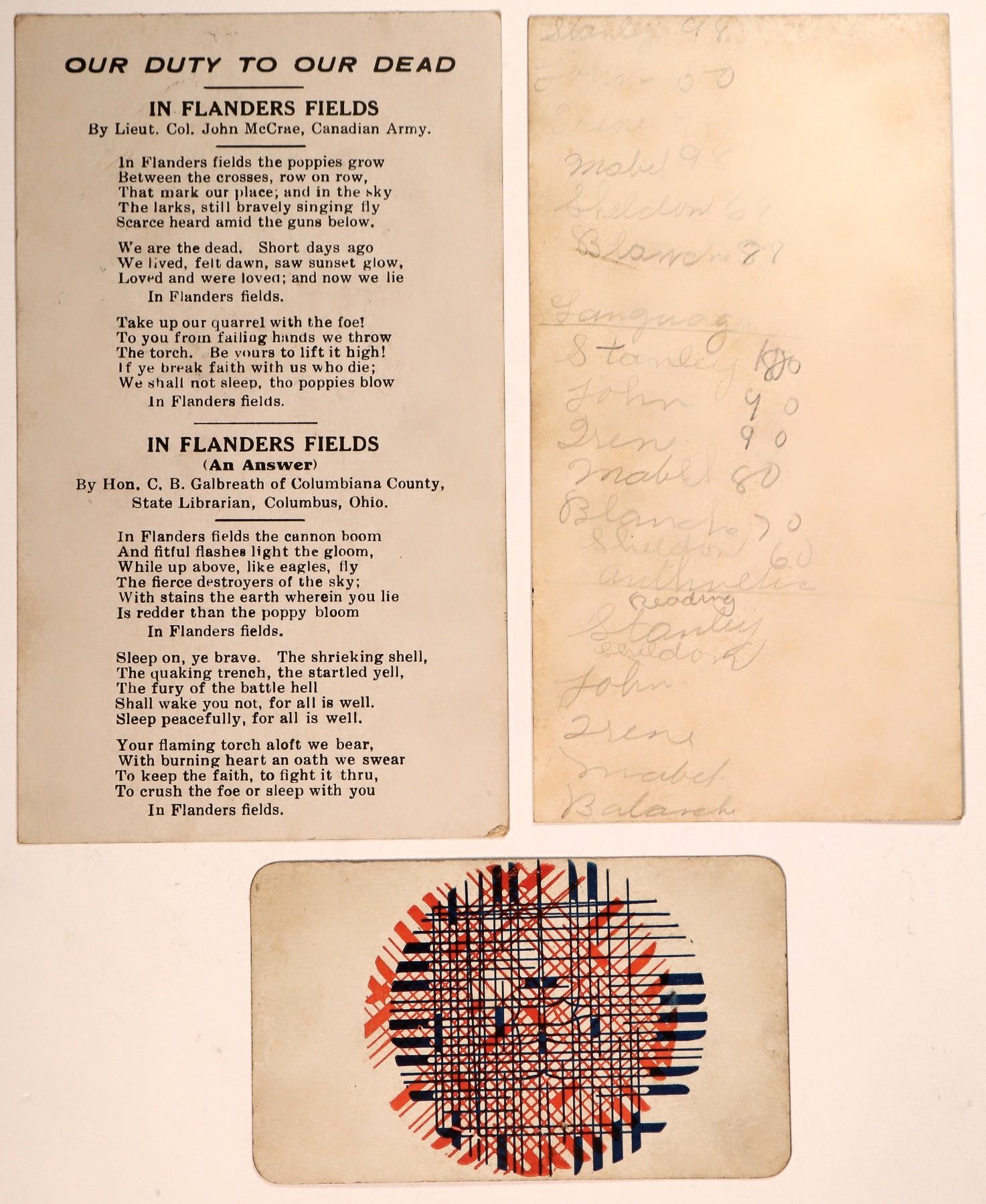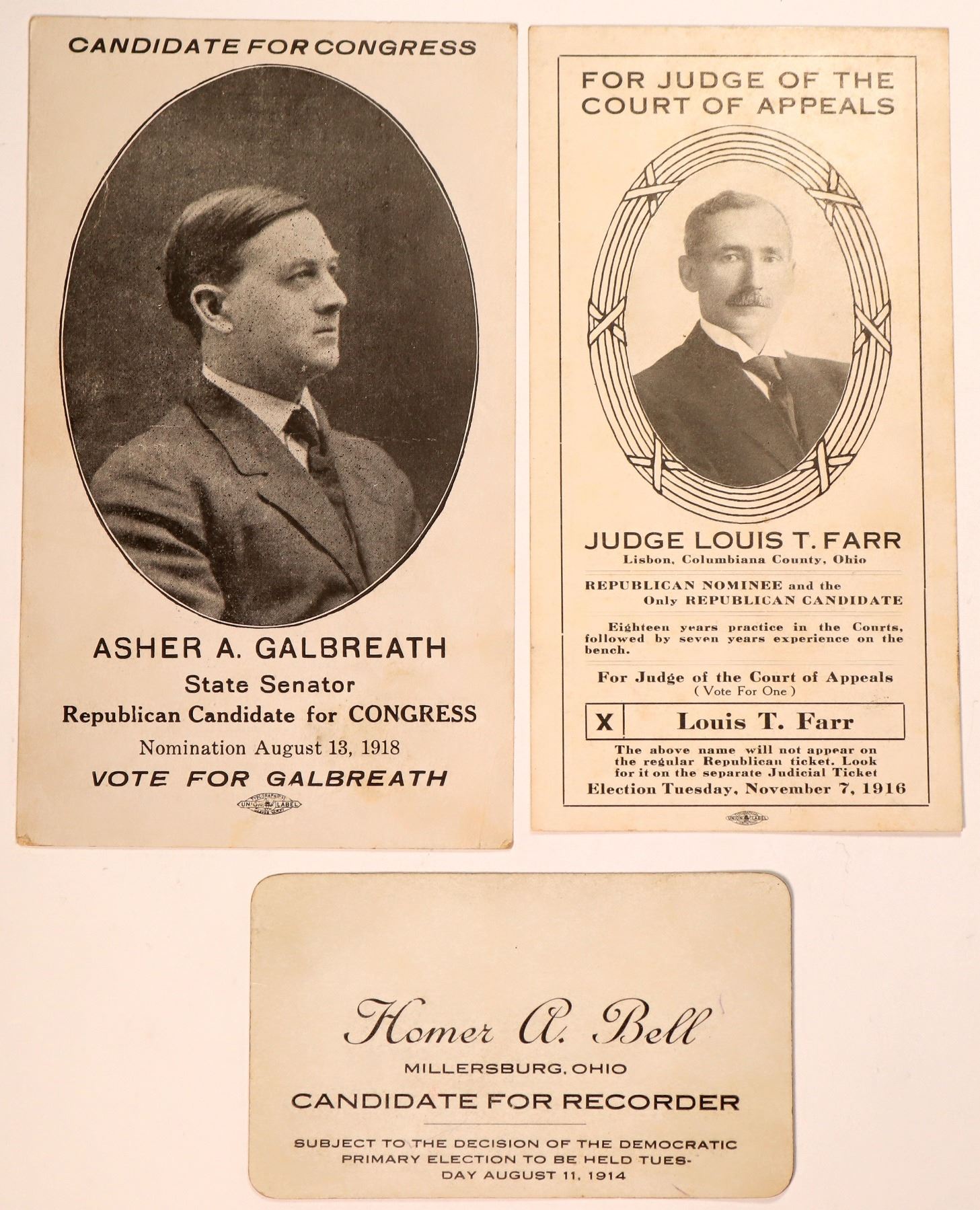 A collection of 3 political advertisements from Ohio, c1914-18. Includes: Homer A. Bell, Millersburg, Ohio, Candidate for Recorder, 1914; Judge Louis T. Farr, for Judge of the Court of Appeals, Lisbon, Columbiana County, Ohio, 1916; Asher A. Galbreath, State Senator, Republican Candidate for Congress, 1918.[ Ohio