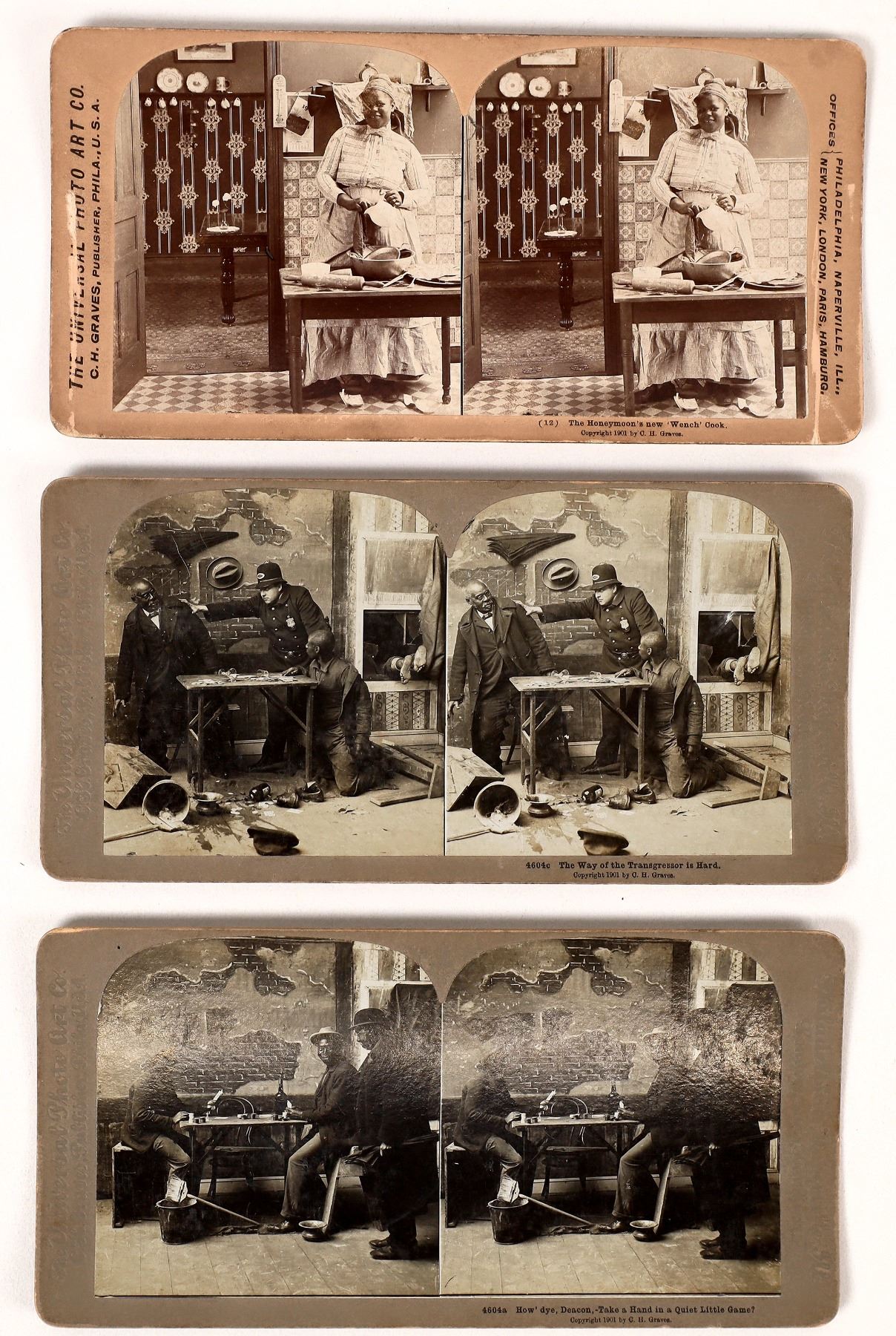 Three stereoviews by C.H. Graves taken in 1901 depicting Black Americans in condescending terms. Group includes three black men at the table, "How'dye Deacon. Take a hand in a quiet little game?". Next view includes a white policeman hassling two black men with the caption, "The Way of the Transgressor is Hard". Last view is a photo of a proud black woman working in the kitchen, captioned "The Honeymoon's Wench Cook".