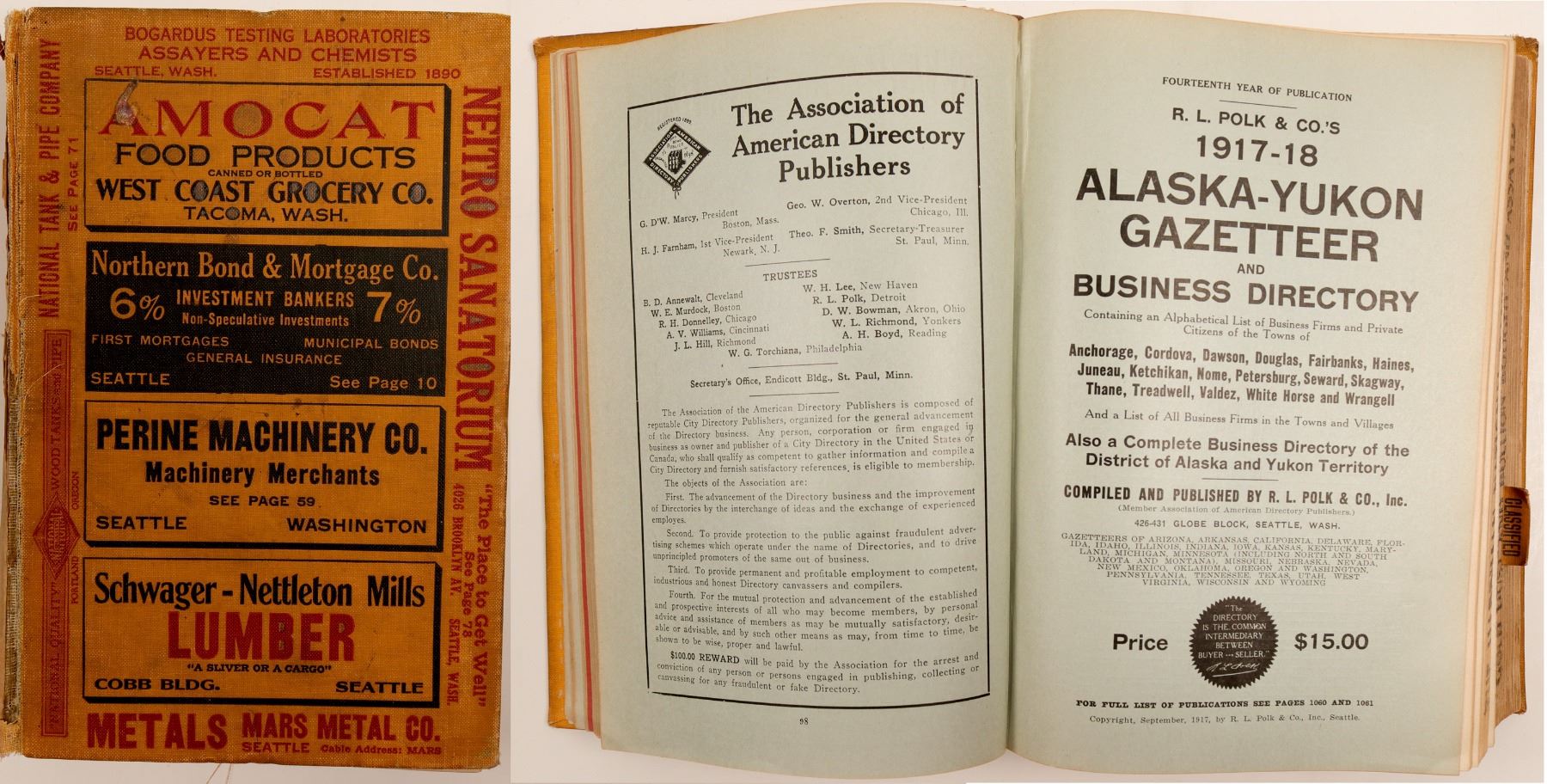 R.L. Polk & Co.'s 1917-18 Alaska-Yukon Gazetteer and Business Directory. R.L. Polk & Co. Inc., Publishers, 426-431 Globe Block, Seattle, Wash. Copyright, September, 1917. 1063 pages. Title page states, "Alaska-Yukon Buyer's Guide/ Consult It Before Buying/All the Leading Houses in Every Line." First 98 pages include ads mostly for Seattle and Portland. "Containing and Alphabetical List of Business Frims and Private Citizens of the Towns of Anchorage, Cordova, Dawson, Douglas, Fairbanks, Haines, Juneau, Ketchikan, Nome, Petersburg, Seward, Skagway, Thane, Treadwell, Valdez, White Horse and Wrangell." Fourteenth Year of Publication. General Index listing alphabetical by name of town. Condition: binding and cover falling apart. Pages bright and clean. Wonderful resource for Alaska history. Rarity: [i] City: State: Alaska Date: