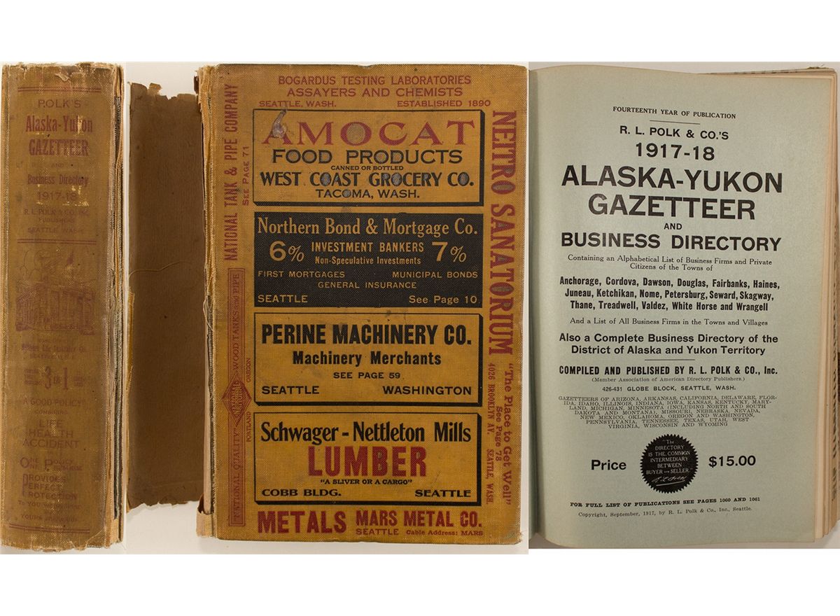 R.L. Polk & Co.'s 1917-18 Alaska-Yukon Gazetteer and Business Directory. R.L. Polk & Co. Inc., Publishers, 426-431 Globe Block, Seattle, Wash. Copyright, September, 1917. 1063 pages. Title page states, "Alaska-Yukon Buyer's Guide/ Consult It Before Buying/All the Leading Houses in Every Line." First 98 pages include ads mostly for Seattle and Portland. "Containing and Alphabetical List of Business Frims and Private Citizens of the Towns of Anchorage, Cordova, Dawson, Douglas, Fairbanks, Haines, Juneau, Ketchikan, Nome, Petersburg, Seward, Skagway, Thane, Treadwell, Valdez, White Horse and Wrangell." Fourteenth Year of Publication. General Index listing alphabetical by name of town. Condition: binding and cover falling apart. Pages bright and clean. Wonderful resource for Alaska history. Rarity: [i]City: County: State: AKDate: