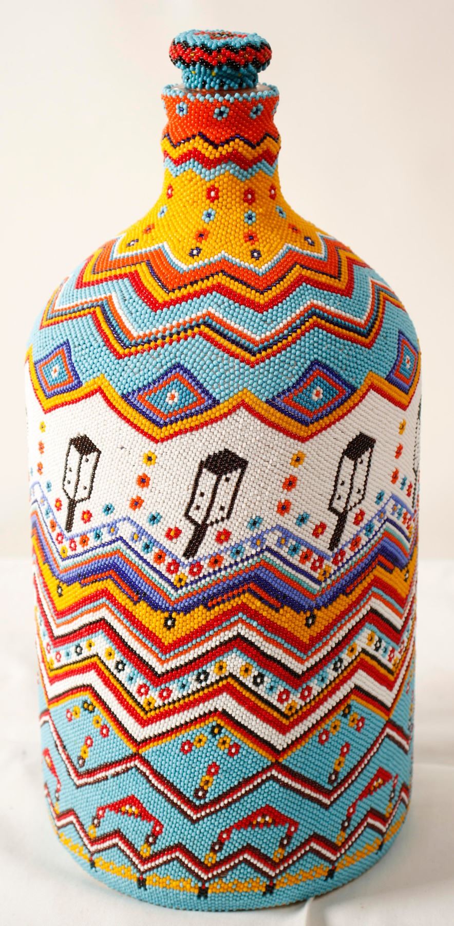 Spectacular beaded bottle by Violet Lowrey, 16.5" tall, 8" diameter, with fitted top- also beaded. geometric designs, 8 colors, probably ten thousand beads! 20th Century State: City: Date: HWAC# 84859