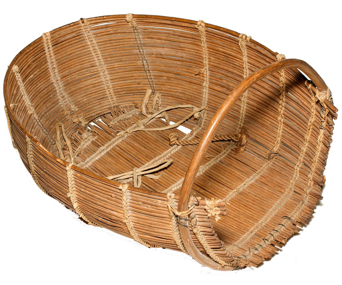 Pomo Indian Sit-Down Cradle, the "U" form cradle made of bent willow branches, wicker work, steel wire secured with cotton cord, with rounded area for child to sit in. This cradle is in good overall condition with moderate wear. The overall length is 18", width is 14" and depth is 6.5". The Pomo people are an indigenous people of California. The historic Pomo territory in northern California was large, bordered by the Pacific Coast to the west, extending inland to Clear Lake, and mainly between Cleone and Duncans Point. The Pomo Indians are known as masters of basket weaving and jewelry making. Some of their most famous dances are “Ghost Dance” and “Far South”. During a “Ghost Dance” ceremony, they believed that the dead were recognized. And a “Far South” dance was celebrated as the rite passage for children to the tribe. Many Pomo languages disappeared and have been replaced by English. There are about twelve Pomo languages that are used by Pomo people nowadays. Most of the remaining Pomo people live in reservations now. The people called Pomo were originally linked by location, language, and cultural expression. They were not socially or politically linked as one large unified group. Instead, they lived in small groups or bands, linked by geography, lineage and marriage. Traditionally they relied upon fishing, hunting and gathering for their food. The name Pomo originally meant "those who live at red earth hole" and was once the name of a village in southern Potter Valley near the present-day community of Pomo. It may have referred to local deposits of the red mineral magnesite, used for red beads, or to the reddish earth and clay, such as hematite, mined in the area. By the year 1877 (possibly beginning with Powers), the use of Pomo had been extended in English to mean the entire people known today as the Pomo.