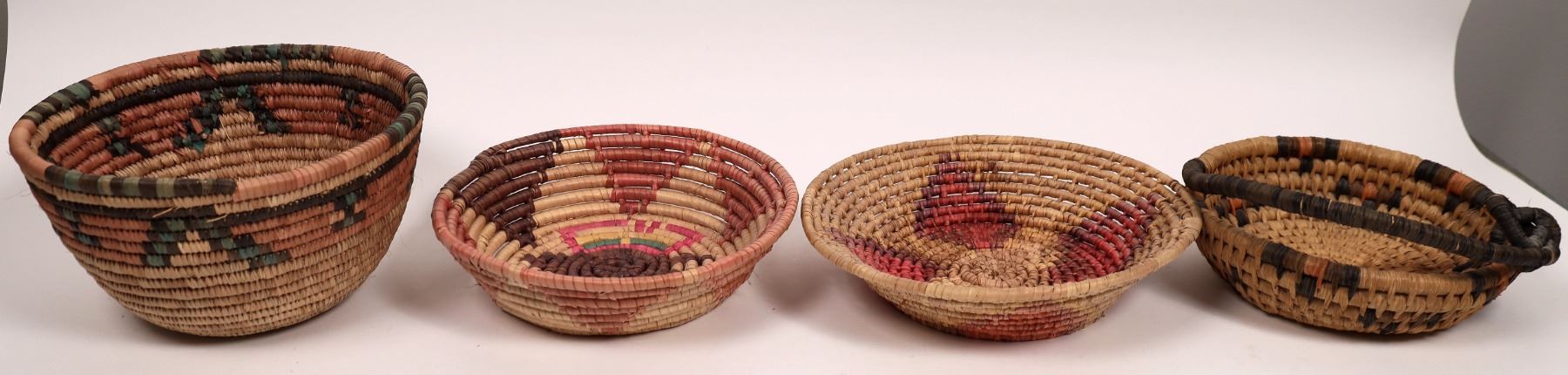 Nice collection of four Pomo/Mexico Indian baskets from southern Arizona and/or Northern Mexico. Classic coarse weave, died fiber. a) 9" diam, three" high with handle; 11" diam, 3" high; 12" diam, 3.5" high; 11" diam, 6.5" tall. All fine-plus.