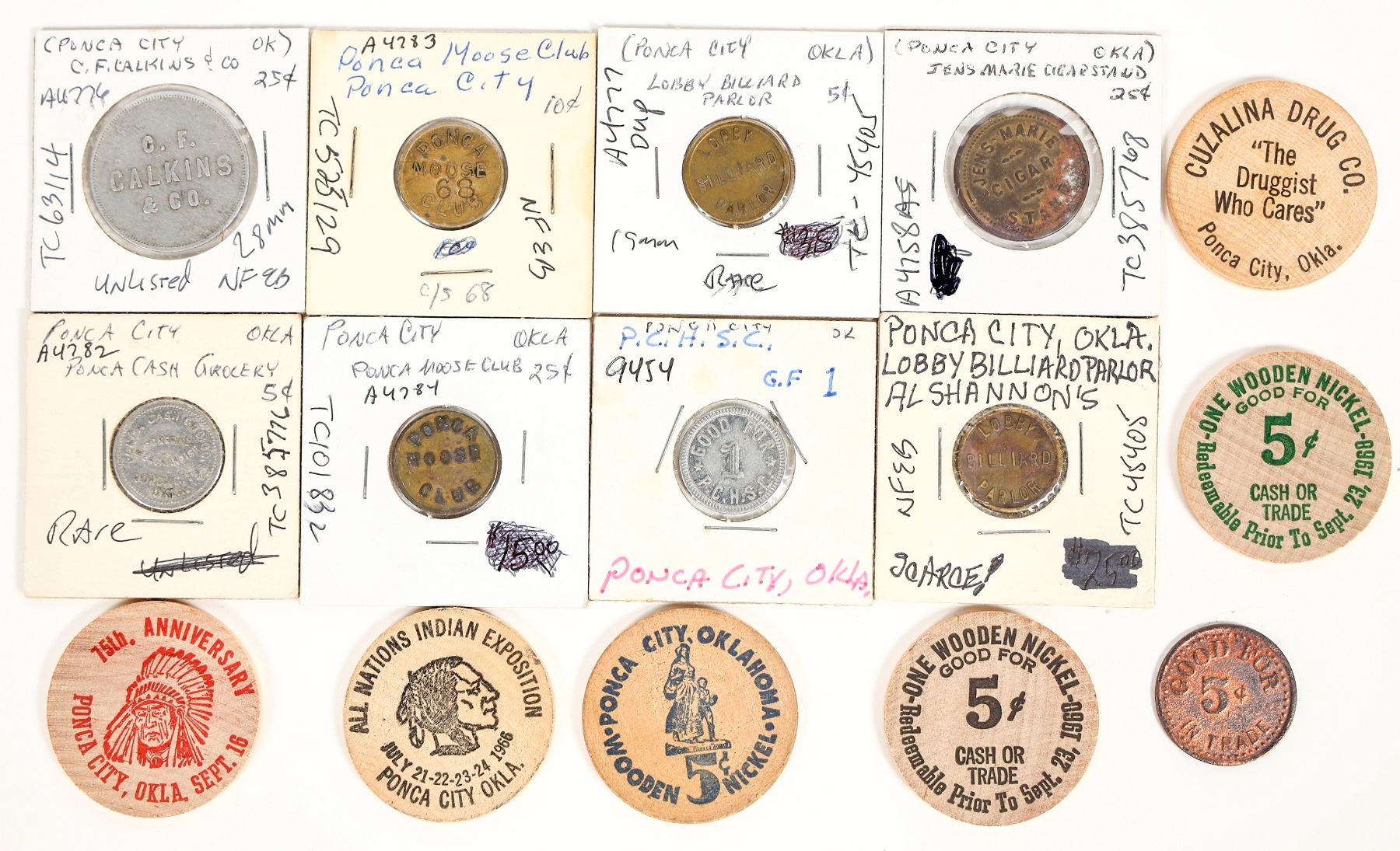 Fifteen pieces from Ponca City: six wooden nickels; nine tokens: Ponca Moose Club (2); Lobby Billiard Parlor (2); Ponca Cash Grocery; High School Cafeteria; Jens-Marie Cigar Store; C. F. Calkins & Co.; W. D. Bryan.