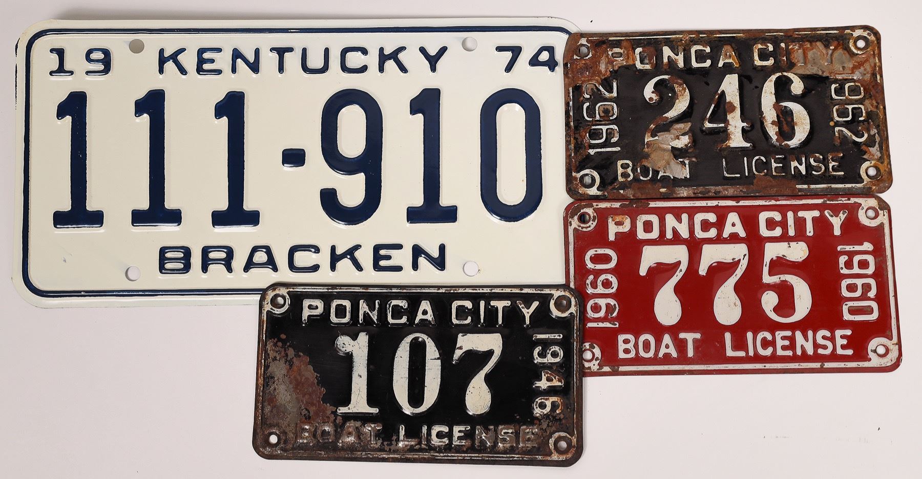 Lot of seven. 1-3) Two 1865 and one 1867-68 bike licenses from Ponca City, Oklahoma. 4-6) Ponca City Boat licenses: 1946, 1960, 1962. 7) 1974 Bracken, Kentucky licenses #111-917. Fitting as it is from the Bracken collection!