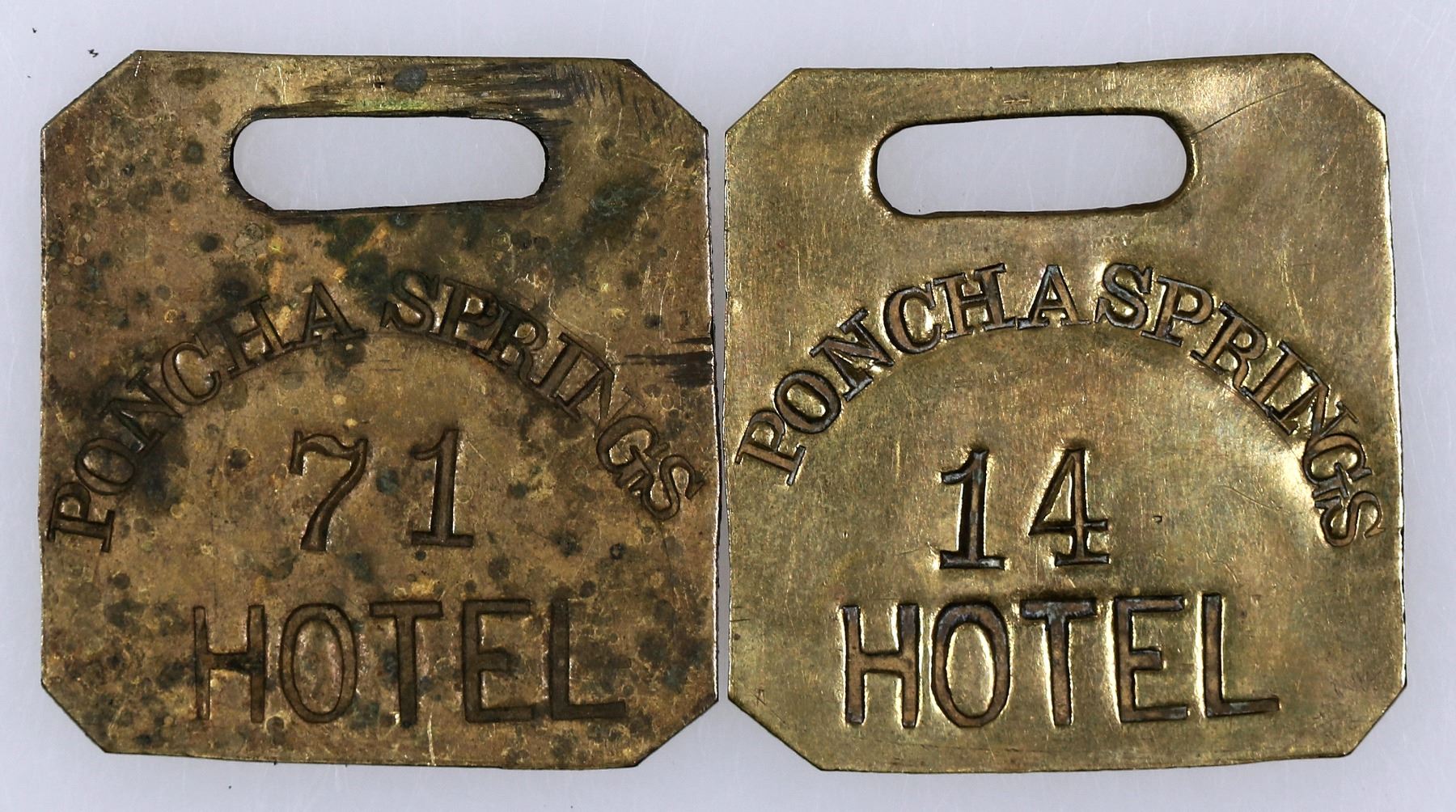 2 brass square Poncha Springs key tags. Poncha Springs, 71, Hotel. Poncha Springs, 14, Hotel.