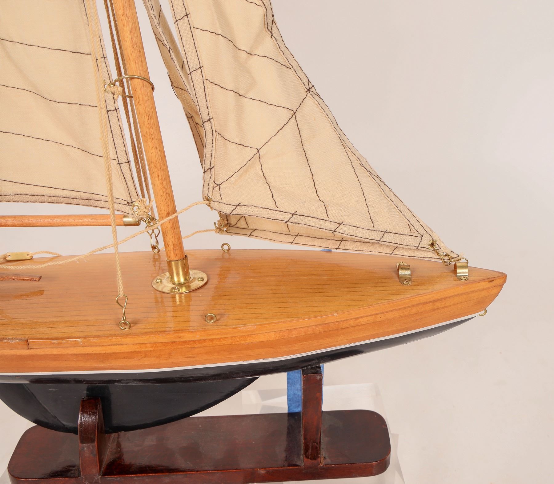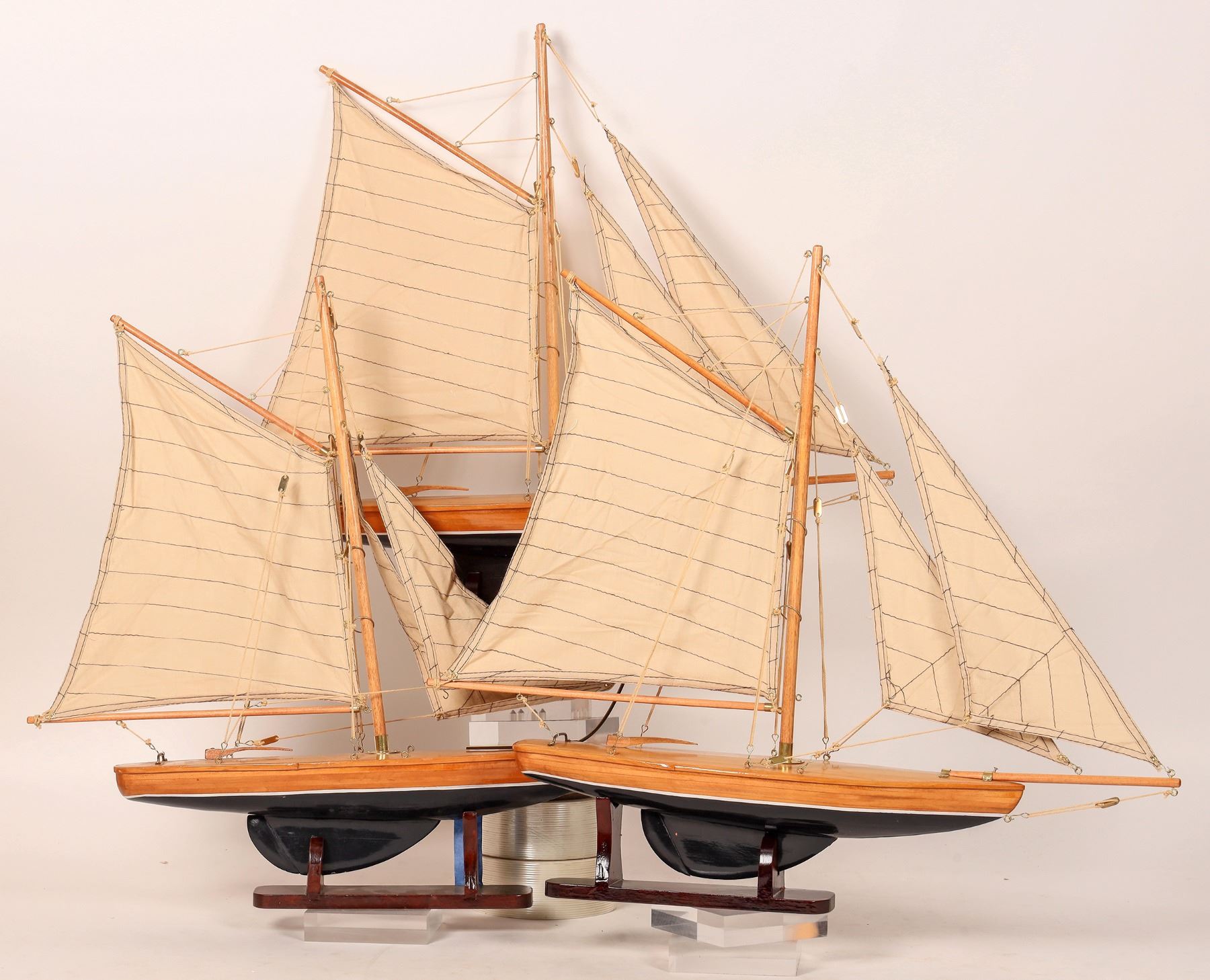 This is a personal fleet of three pond schooners ready for the next America's Cup - (Pond Class). They are all at 20 in. overall length, 4 in. beam (width), about 3 in. draft (depth below the waterline), 20 in. tall with 25 piece hand-laid decks. Complete with a fixed rudder. A tack is prepared by setting the gaff rigged main-sail & the two foresails. One boat is in need of drydock repairs & must be refitted for a bowsprit (now missing). Please see photos for details. [Chunlin Zhu Collection] [