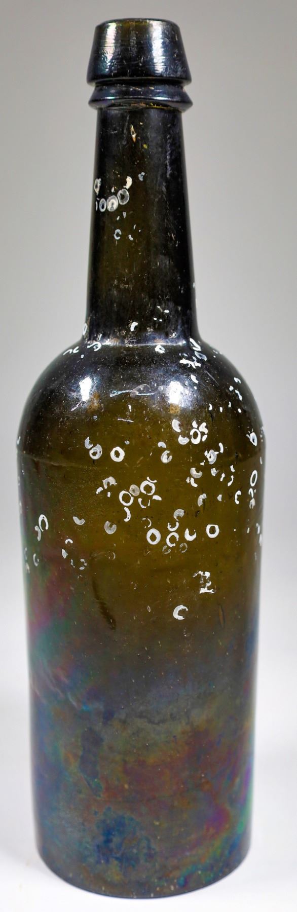 Pontil Black Glass Applied Top Whiskey Bottle, sunken treasure. Early 3 piece mold, barnacle remnants not cleaned off, pontil base, deep green, heavy whittle. Choice.
