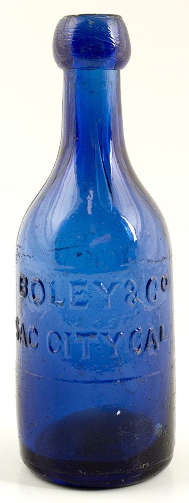 Boley & Co / Sac City Cal //. ( 1850--1862 ): Medium cobalt blue. Pro cleaned, with light wear and minor pitting remaining. But, there is a 3/8" inside lip bruise. Very nice.., 1" x 1/4" elongated tear drop bubble in the front shoulder, as well as a 1" x 1/2" elongated bubble, under the embossing, on the reverse side of the bottle.Very nice specimen. HWAC# 29871 Date: Location: Sacramento, California