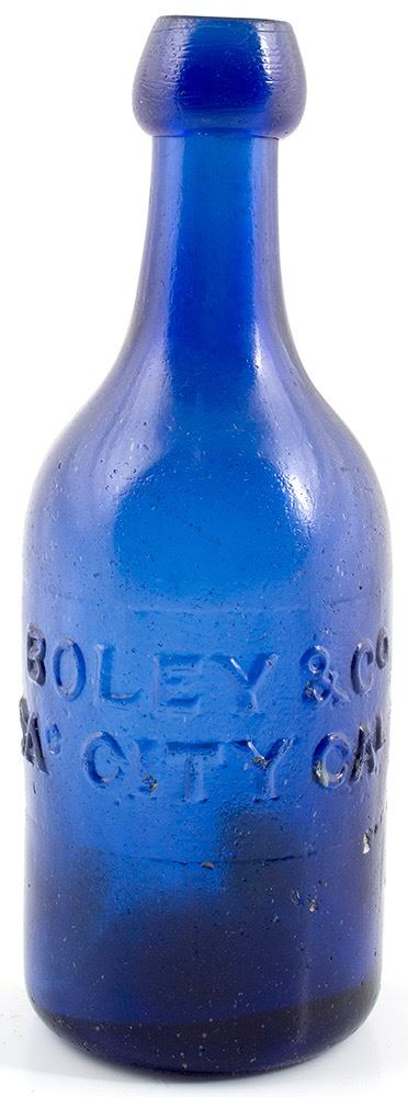 Boley & Co / Sac City Cal // ( 1850-1862) : Medium cobalt blue. Rare embossed variation, with a small " c", in " Sac". Needs cleaning , and has a 3/8" bruise in the top . also, 5 body dings. Nice color. HWAC# 30067 Date: Location: Sacramento, California
