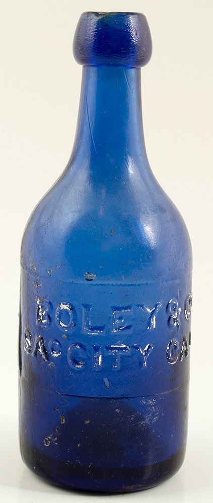 Boley & Co / Sac City Cal // ( 1850-1862.) : Rare embossed variation with the small letter "c" , in "SAc". Medium cobalt blue. There is a 3/8" inside lip bruise, as well as a 3/16" bruise on the front over the letter " L" in Boley. Looks very nice , with no wear and hardly any pitting. Would clean nice. Date: Location: Sacramento, Cal., California HWAC# 29869