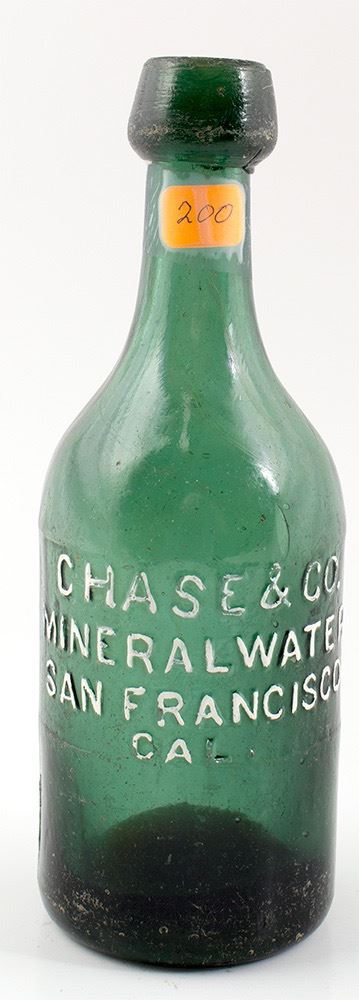 Chase & Co / Mineral Water/ San Francisco/ Cal. ( 1853-1855) : Medium forest green. Light case wear, and some pitting overall. One 3/16" half moon...very minor. Would clean up very nice. No other chips, flakes, dings or problems. Date: Location: San Francisco, Cal., California HWAC# 30403