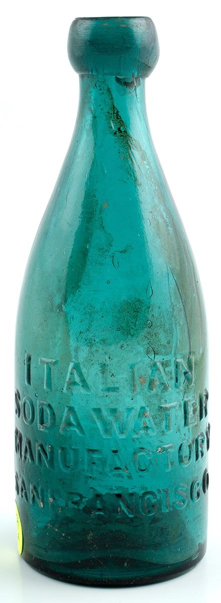 Italian / Soda Water / Manufactroy / San Francisco // Reveres : Union Glass Works / Phila // : ( 1856-1863 ) : Medium to light teal color. Cloudy inside, never cleaned. Would come out really nice . The glass on this specimen is really nice, MINT. But, there is a 3/8" crack under the blob top, on the front side..Plus a large 1 1/2" x 1/4" teardrop bubble in front, intersecting the embossing. Nice looking. HWAC# 29781 Date: Location: San Francisco, California