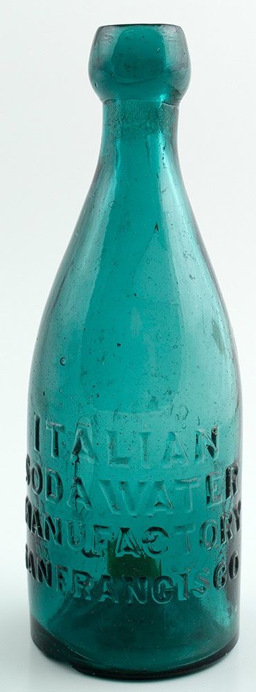 Italian / Soda Water / Manufactory / San Francisco // Reverse: Union Glass Works/ Phila // ( 1856-1863): Light to medium teal . Pro cleaned, with medium stress marks in the neck, and light scratching in one area.. Large base chip, that follows the contour of the base . Hugh 1" x 3/4" bubble on the reverse shoulder. Very rough, jagged metallic pontil Very clean, nice looking specimen. Date: Location: San Francisco, Cal, California HWAC# 29789