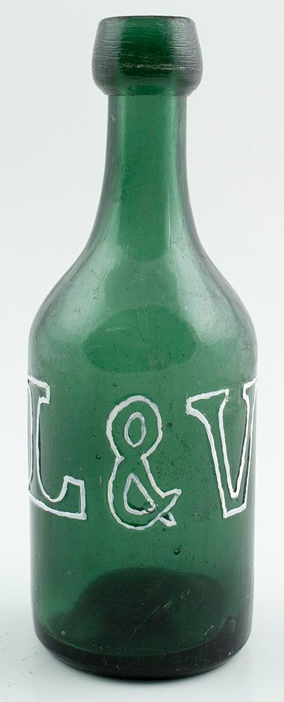 L & V ( Lippincott & Vaughn ) ( 1852-1857): Medium forest green. Really nice condition, near mint with a few light scratches.. Needs cleaning to be mint. Small 1/4" bubble , in making, rolled in edges, near the base. Four nice bubbles, scattered, in the right front shoulder area. No chips or cracks. Date: Location: Stockton & Marysville, California HWAC# 29772