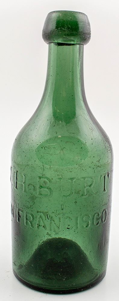 W. H. Burt / San Francisco // ( 1852 Only): Medium forest green. Light case wear and a few scratches. Clean, but needs polishing. Very nice grouping of four bubbles, on the right side of the bottle. Date: Location: San Francisco, Cal., California HWAC# 30569