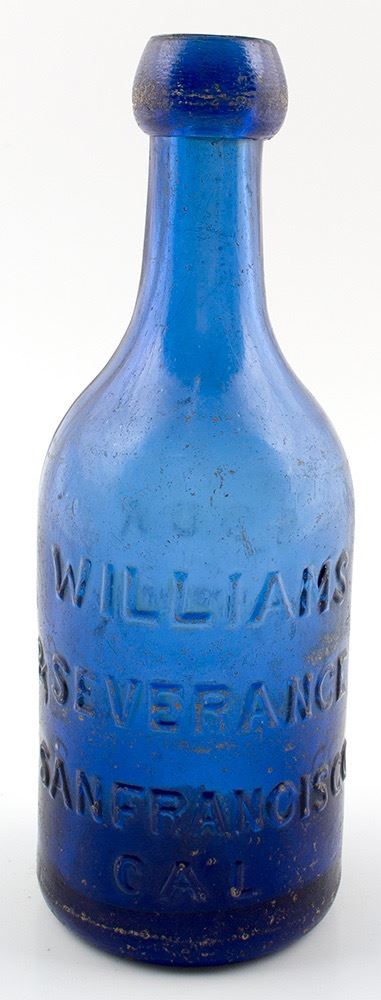 Williams / & Severance / San Francisco /Cal // Reverse : Soda & / Mineral / Waters // : 1852-1854. Medium cobalt blue. Medium to light , over all case wear. No Chips or cracks, would clean up...really nice. Date: Location: San Francisco, Cal, California HWAC# 30547
