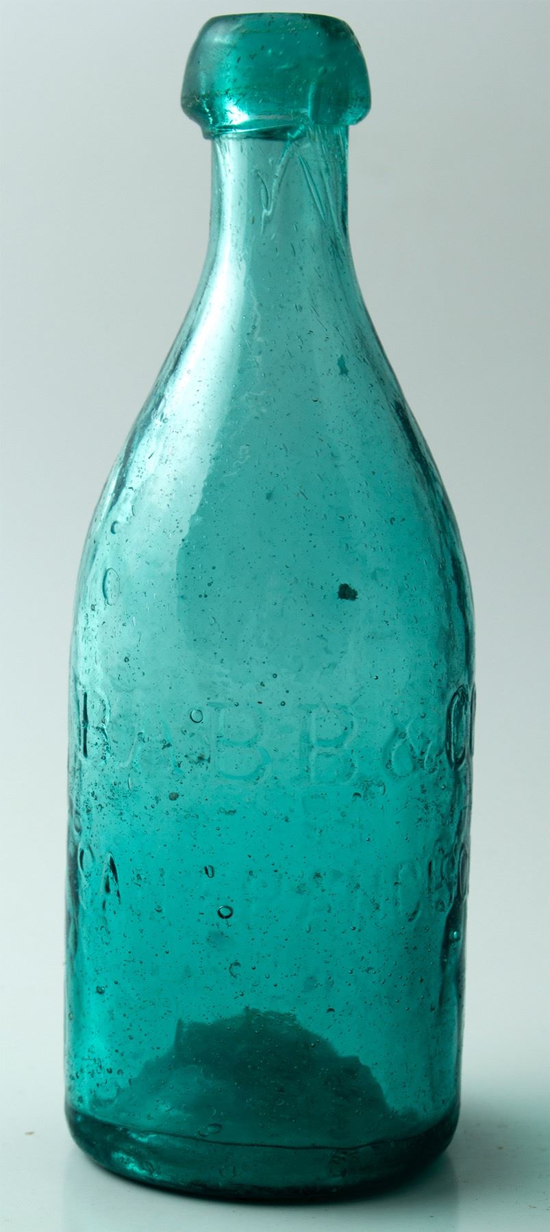 Babb & Co / San Francisco / Cal. // ( 1852-1854 ) Brilliant aqua, hammer whittled, and a lot of tiny bubbles. Giant 1" bubble left front shoulder, Rare in aqua. But, there is 2, 3/8" inside lip bruises. Nice display item. State: California City: San Francisco Date: HWAC# 30003