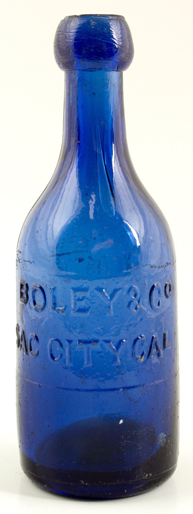 Boley & Co / Sac City Cal //. Medium cobalt blue. Pro cleaned, with light wear and minor pitting remaining. But, there is a 3/8" inside lip bruise. Very nice.., 1" x 1/4" elongated tear drop bubble in the front shoulder, as well as a 1" x 1/2" elongated bubble, under the embossing, on the reverse side of the bottle.Very nice specimen. RH)Fred Holabird Collection