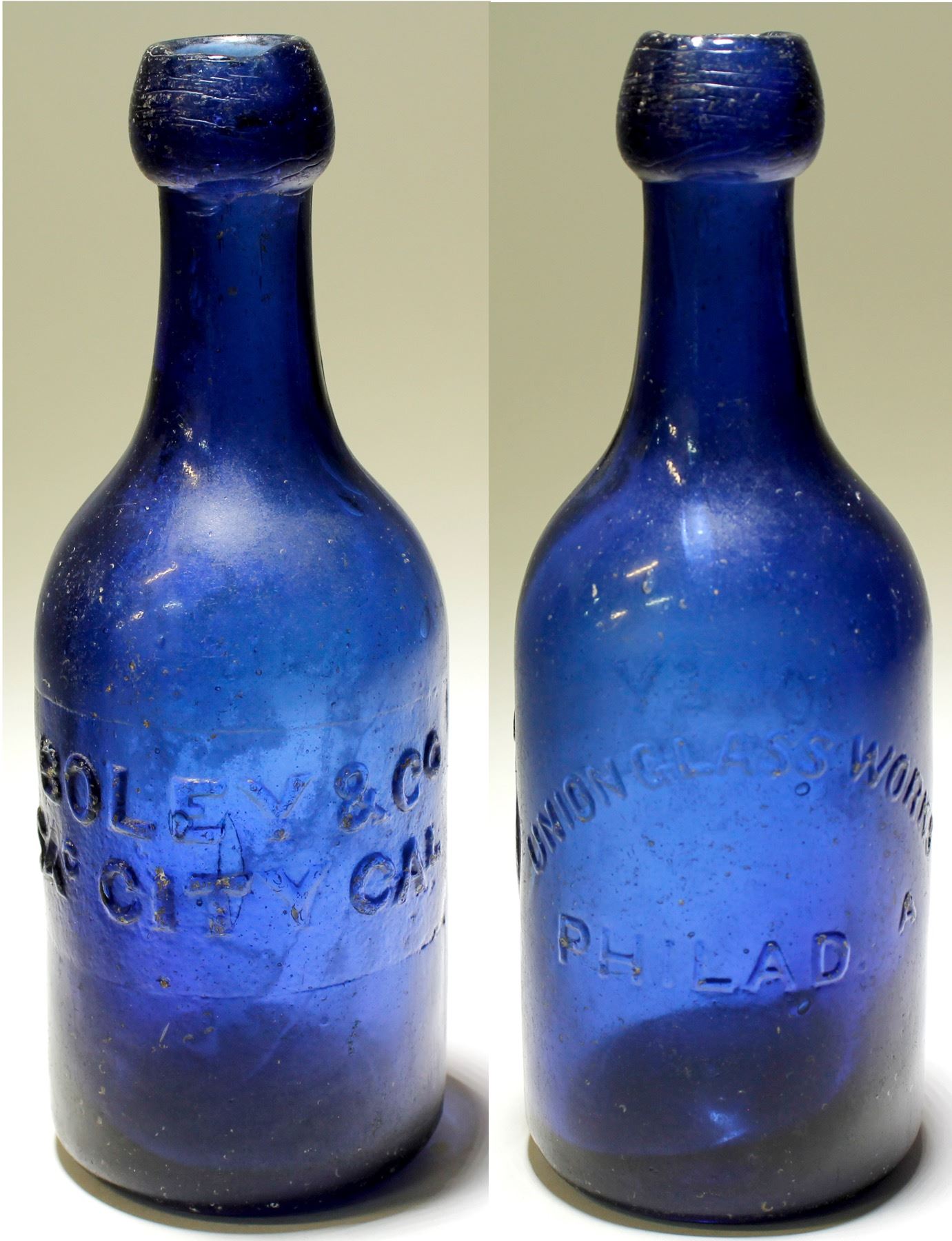 Boley & Co / Sac City Cal // ( 1850-1862 ): Medium to deep, cobalt blue. Large 1/2" chip on top, 1/4" under blob chip, as well as a 1/4' flake off the letter " A" in the word 'SAC". . Very little wear or pitting, needs polishing.. State: California City: Sacramento Date: HWAC# 53340