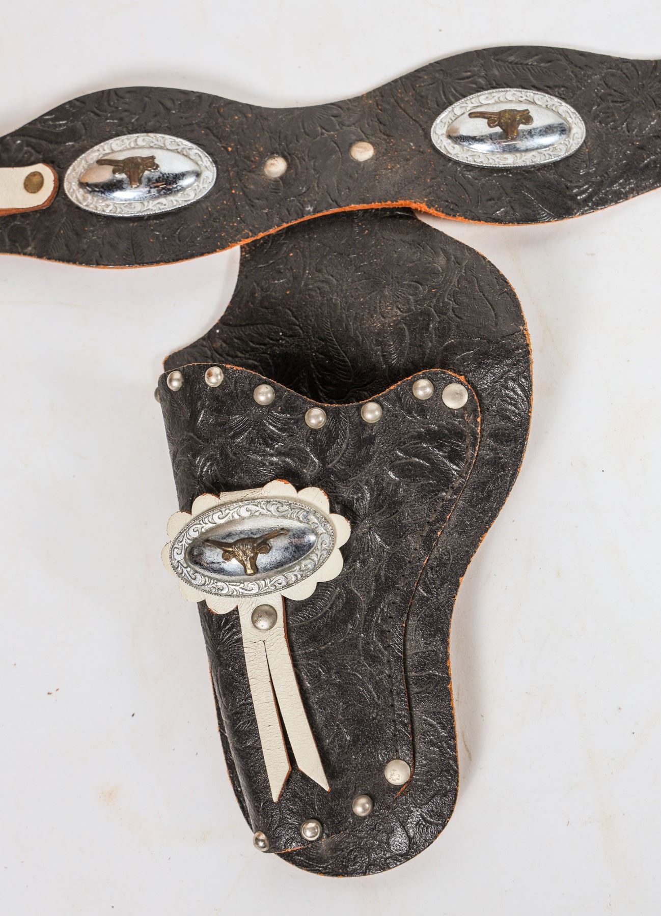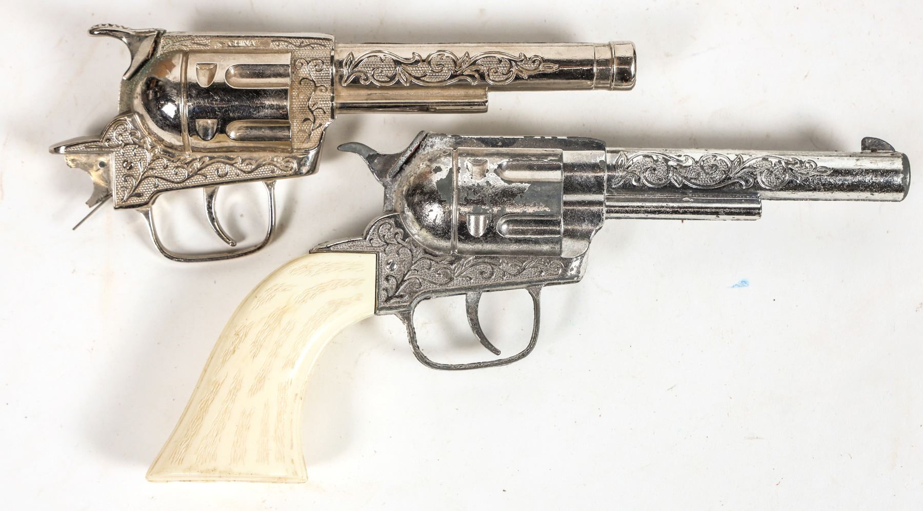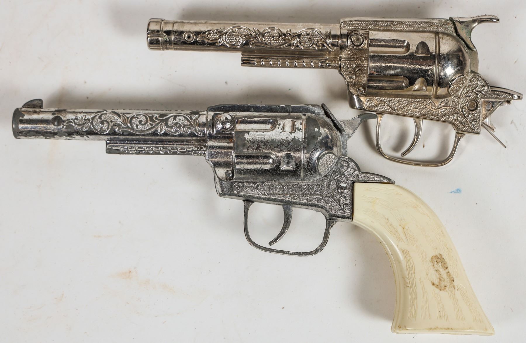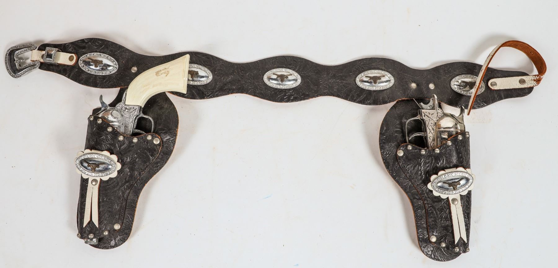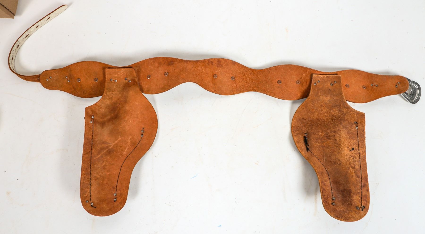 This lot has two "Pony Boy" pistols. One pistol has a broken grip and the other gun works poorly. The leather is in very good condition. Please see photos for details.