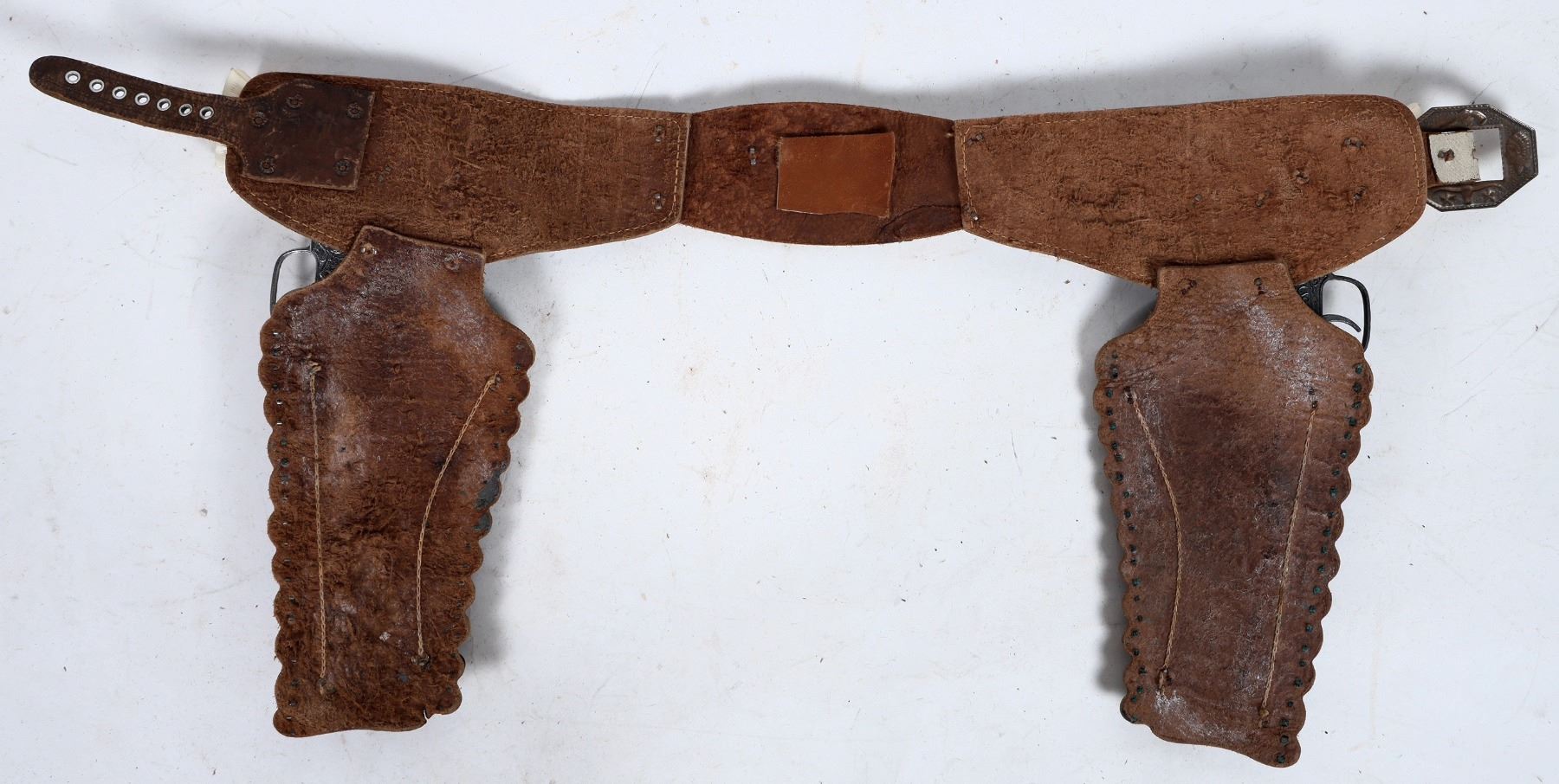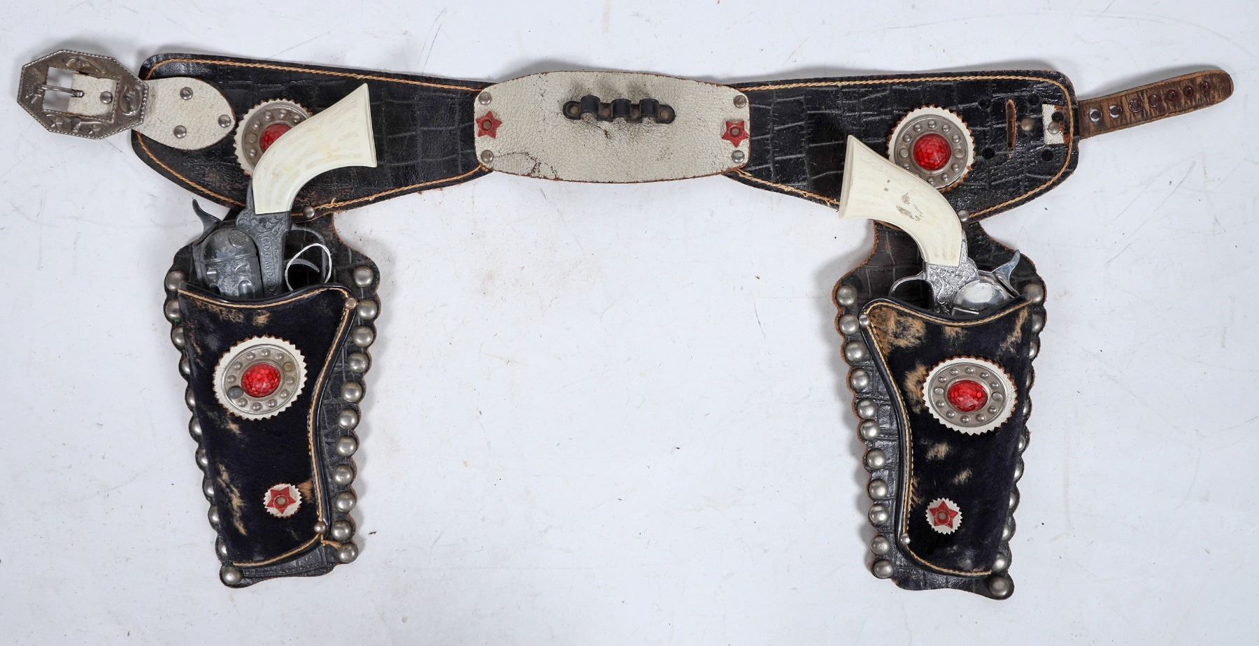 Very fancy and attractive Pony Boy matched pistols in cowhide covered holsters with faux ruby conchos.